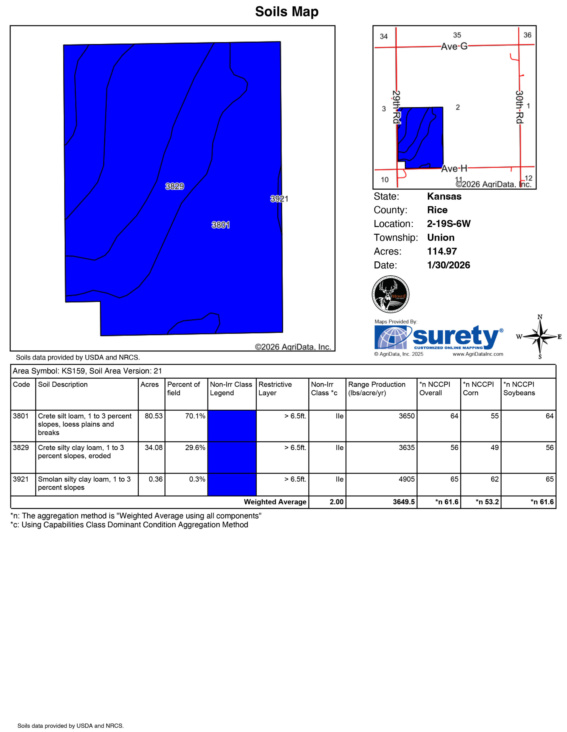 This farm is comprised of Crete & Smolan Silt and Silty Clay loams and carries a strong overall NCCPI score of 61.6. Strong soils like this will respond to the right recipe of fertilizer and moisture for any growing crop. Current FSA acres are estimated at 111.83 acres. This farm has well-maintained terraces and a waterway that keeps erosion minimal. The waterway is a good mix of mostly brome, allowing you to put up a few nice bales every year for cattle. Power is along 29th Road, as well as rural water, are present for any future building needs.