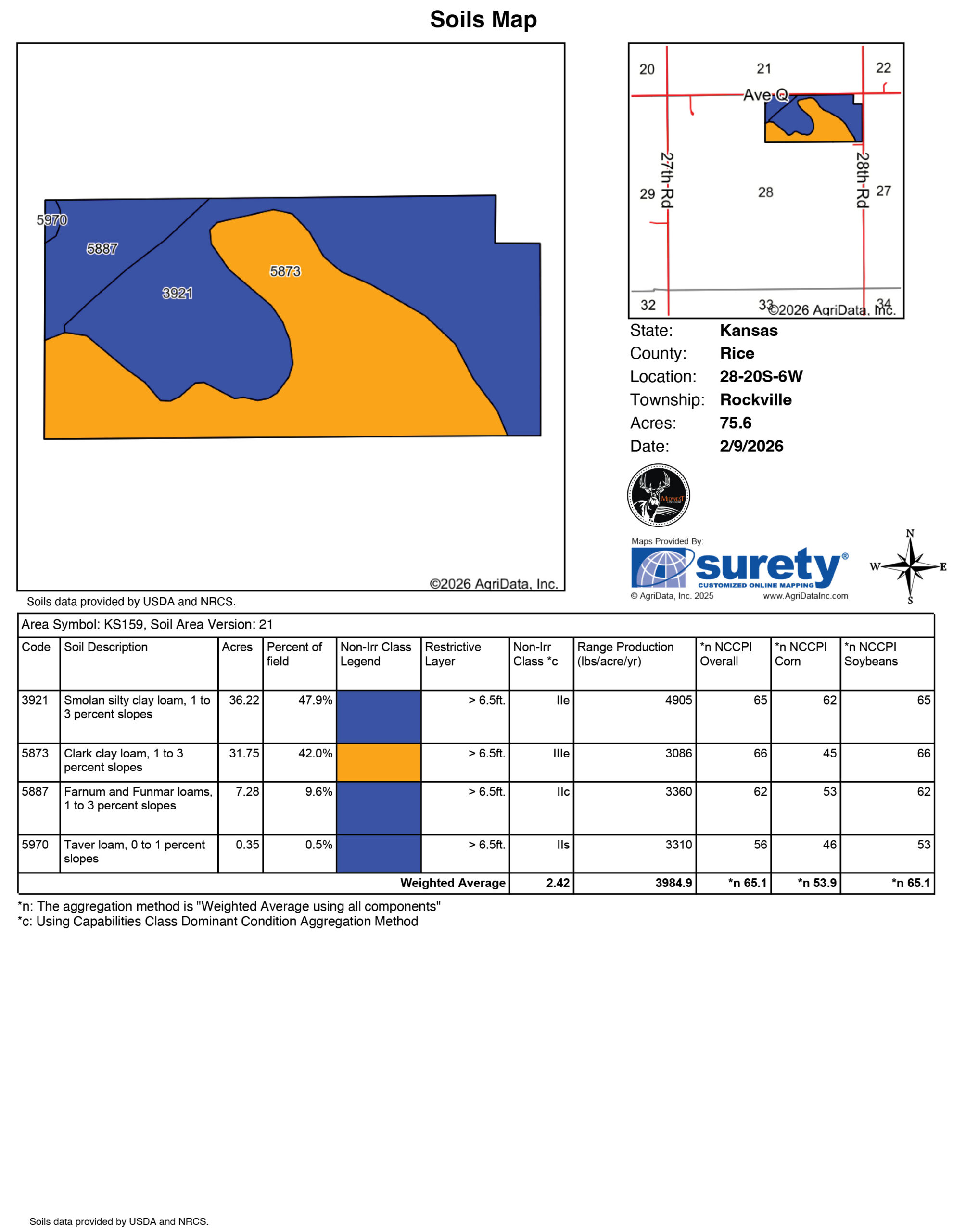The tillable land is a nice mix of Smolan, Clark, and Farnum clay loams. The farm lays nice with 1% to 3% slope,s allowing for quick, efficient field work. The farm offers a solid NCCPI score, averaging out at 65.1, giving it a strong ability to produce and respond to the right nutrient programs. The farm contains 69.5 USDA field acres.