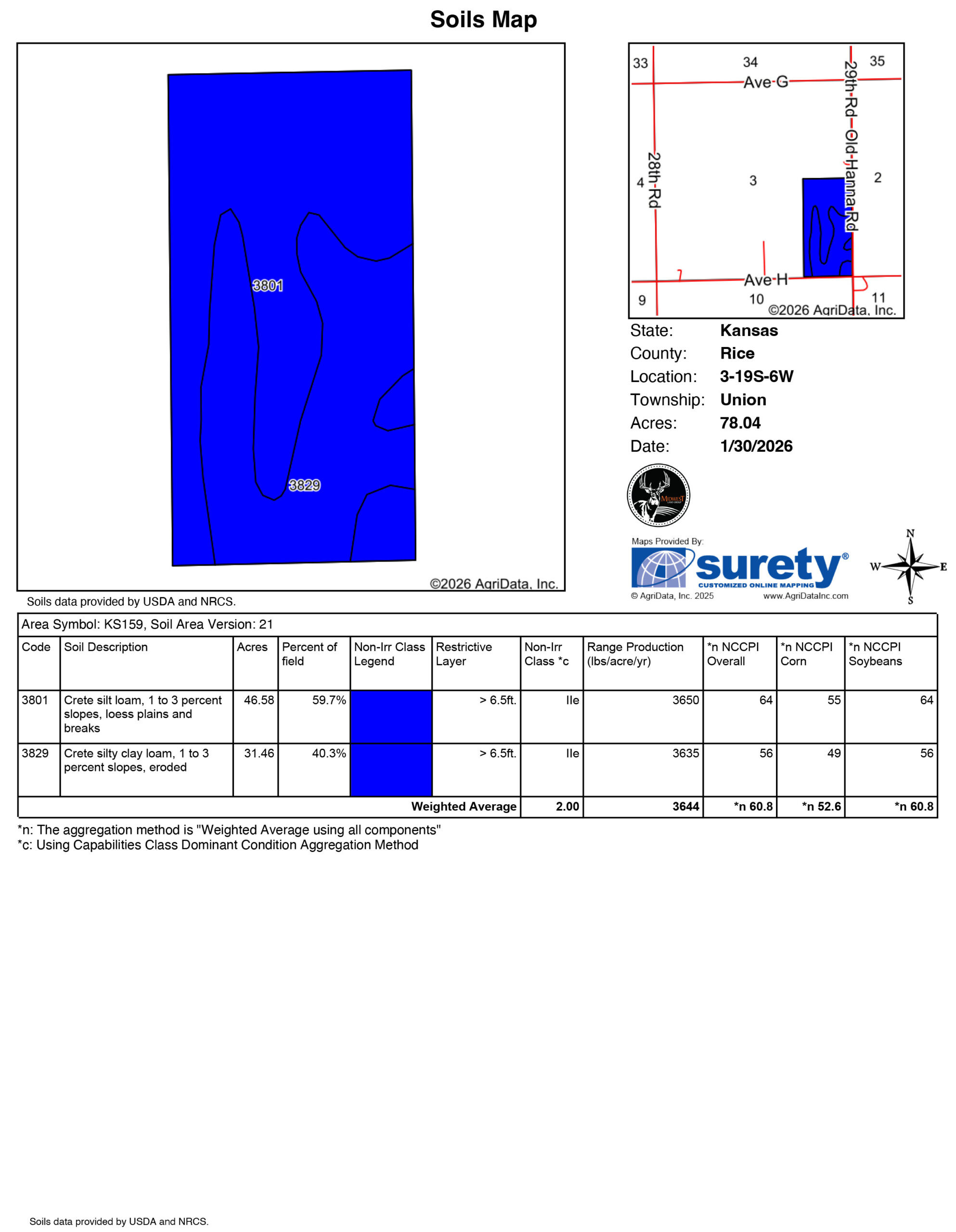 Outside of Little River, Kansas, at the intersection of 29th Road and Avenue H, sits this 78 +/-acre tillable tract. With little slope and wonderful soils, this farm will make a great addition to your existing operation or be a great balance to any investor's land portfolio. This farm is comprised of Crete Silt and Silty Clay loams and carries a strong overall NCCPI score of 60.8. Strong soils like this will respond to the right recipe of fertilizer and moisture for any growing crop. Current FSA acres are estimated at 79 acres. Power is along 29th Road, as well as rural water, are present for any future building needs.This farm is 100% tillable and, with all Class II soils, will keep pushing yields for many years to come. Opportunities for top-tier ground are not available often! Just across the road is Tract 2, which would give you an additional 115 +/- acres right next door. Giving you added benefits to make an efficient day with equipment or enough room to winter wheat pasture cattle. To answer questions regarding possession or current tenant arrangements, please call Tyler Heil at (913) 207-4541.