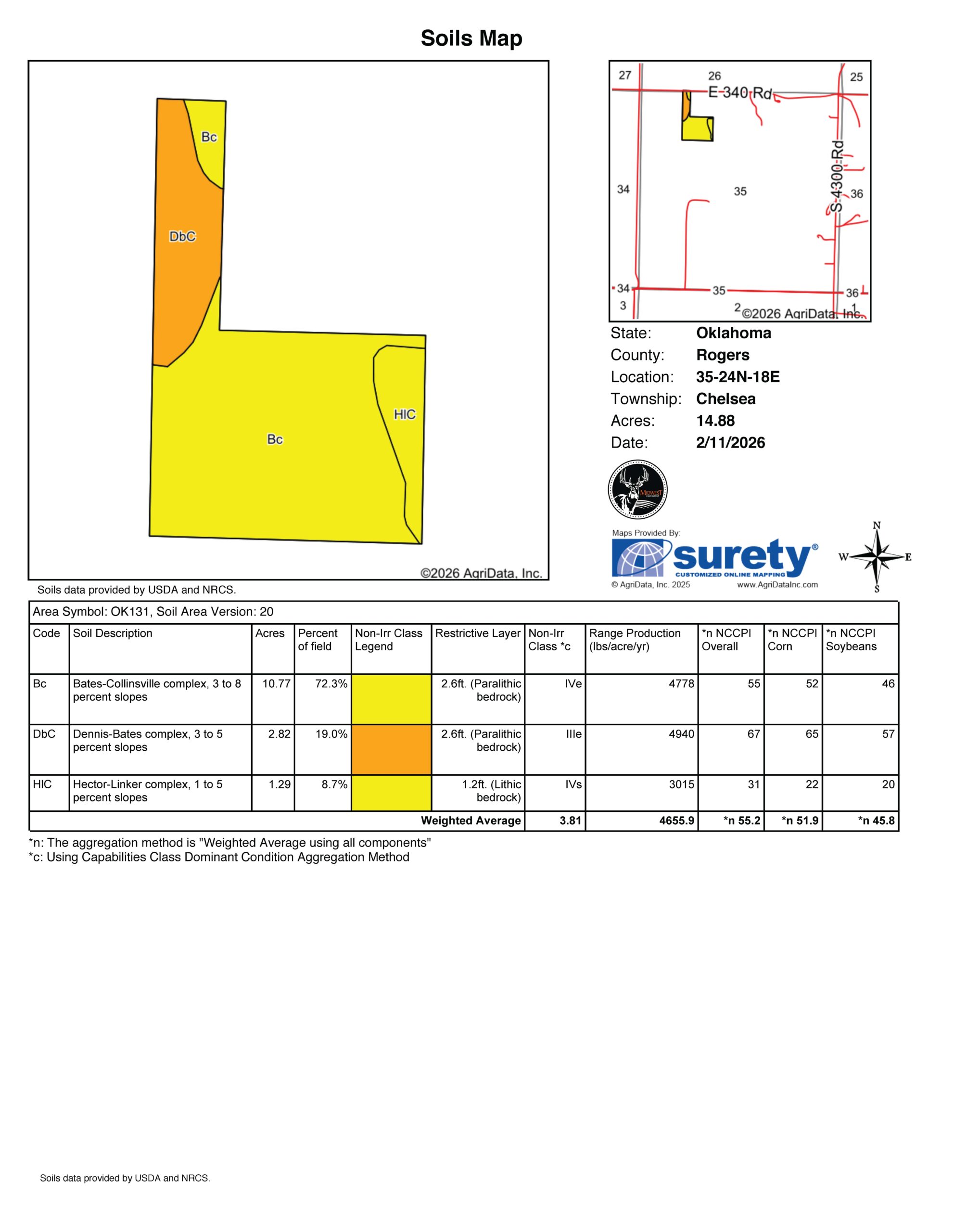 Midwest Land Group is offering this 15 +/- acre hobby farm northeast of the community of Chelsea. Located in the Chelsea School District, with easy access to Oologah Lake and a quick commute to Vinita, Claremore, Owasso, and Tulsa, this farm will provide a great landscape for your future homestead. The farm has a great mix of rolling Bermuda and native bluestem pasture for your livestock operation. An ample water source for your livestock is available via the pond located in the southeastern portion of the farm. There is also a set of working pens in the northwest corner of the farm. Utilities are available along East 340 Road, and water has been run to the property with a meter already in place for your future build site. Give Kevin Williams a call at (918) 559-8960 to view this Rogers County Farm.