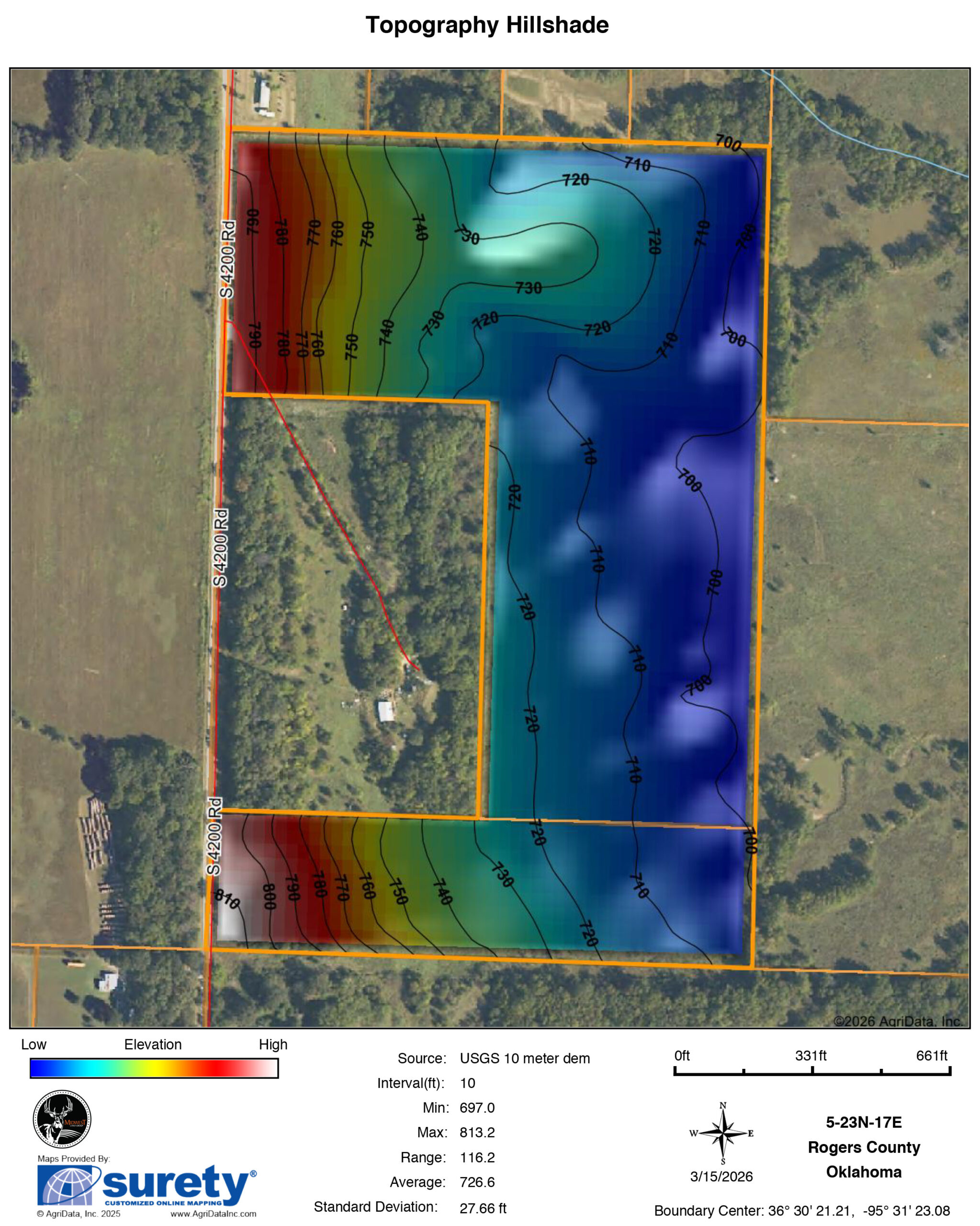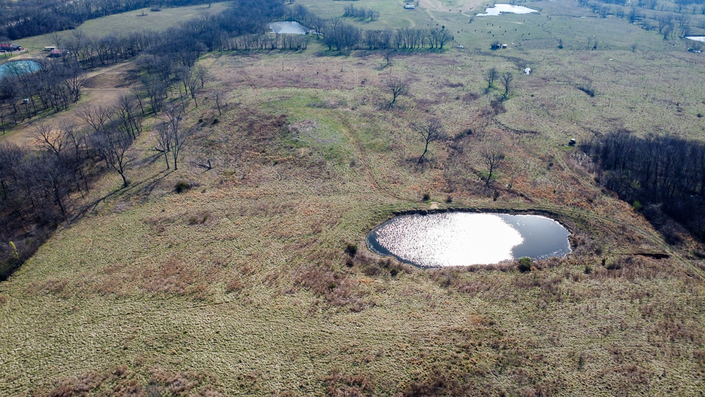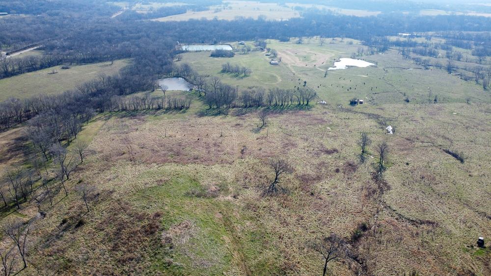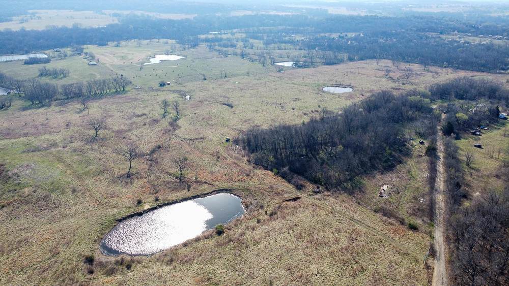 The farm includes two ponds that provide reliable water sources for cattle and wildlife, while 116 feet of elevation change creates attractive rolling terrain and scenic views across the surrounding countryside. With utilities available and county-maintained blacktop road frontage, access, and future development are both convenient and practical.