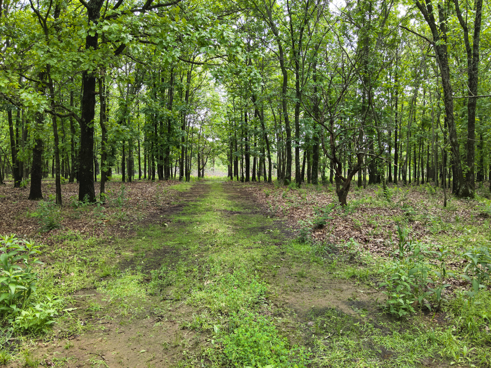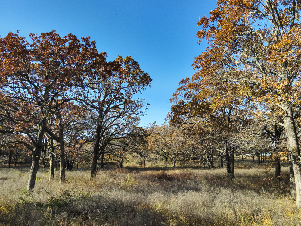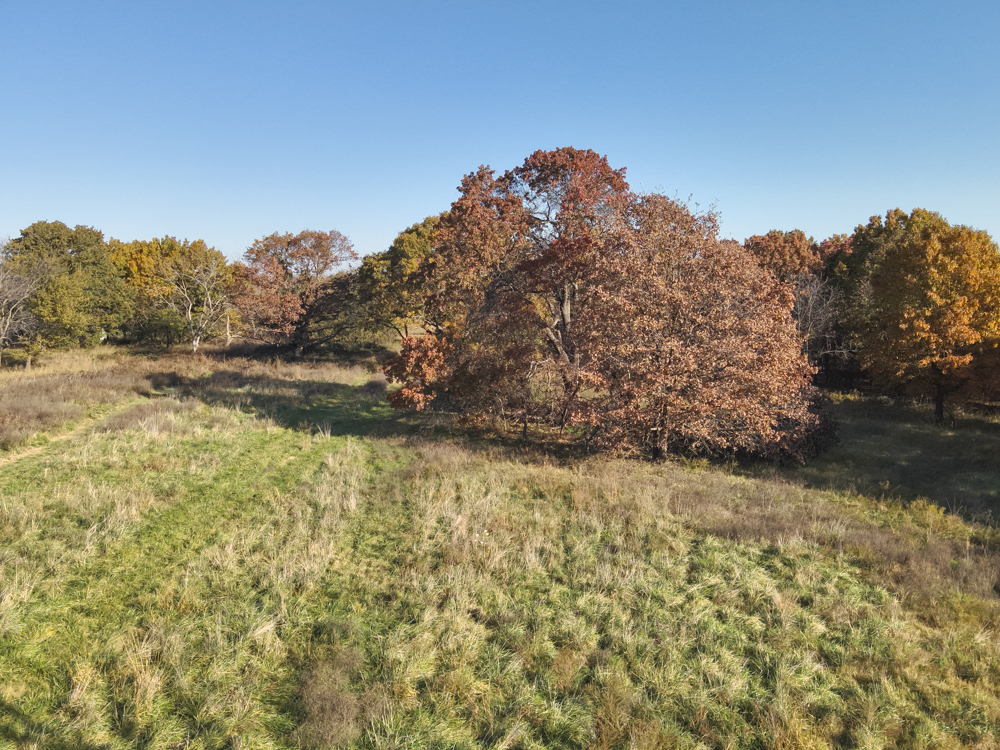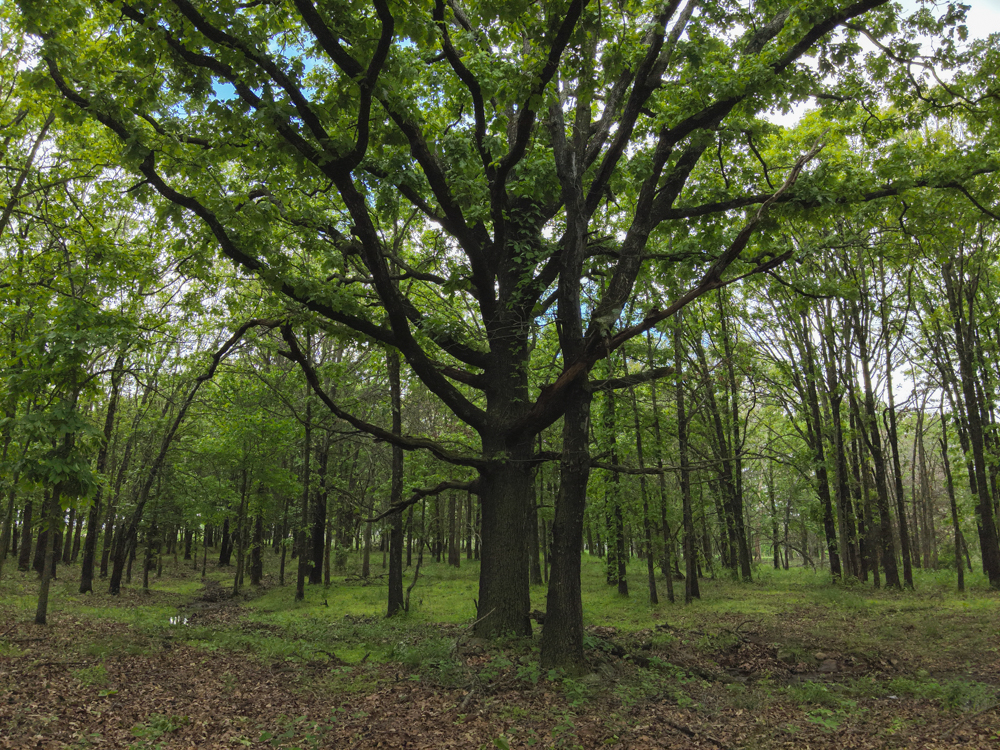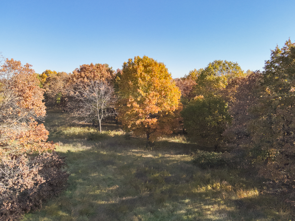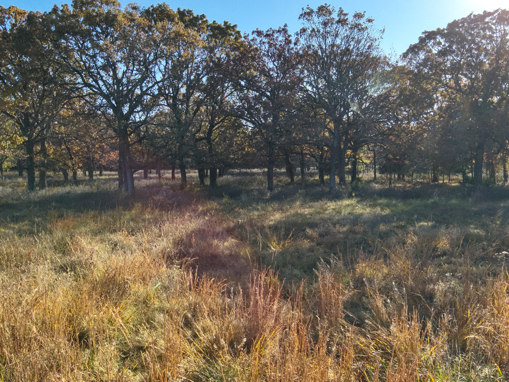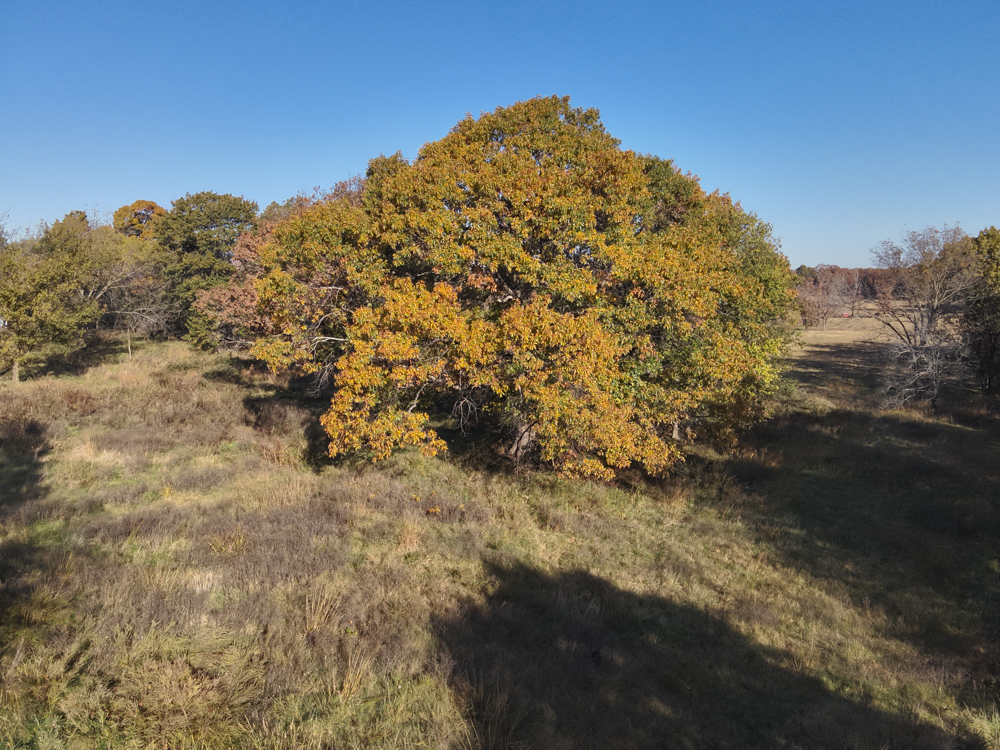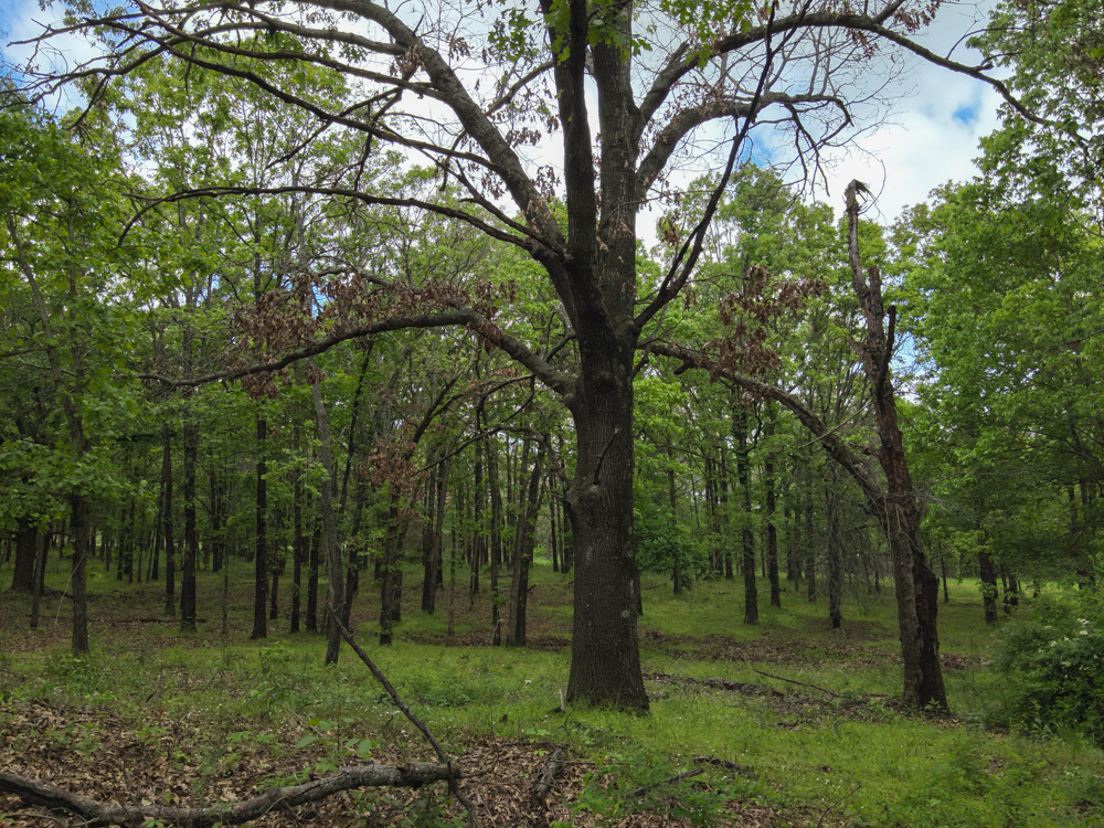 - Large oaks and walnut trees throughout