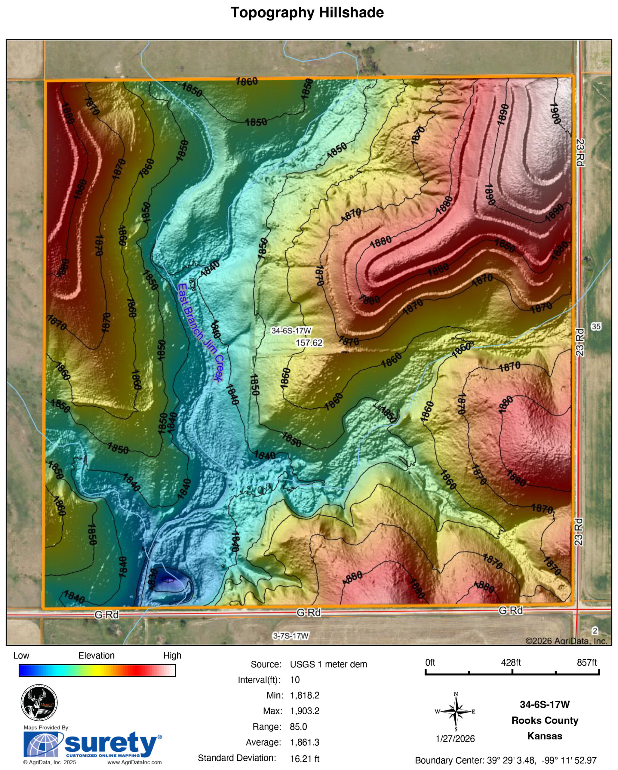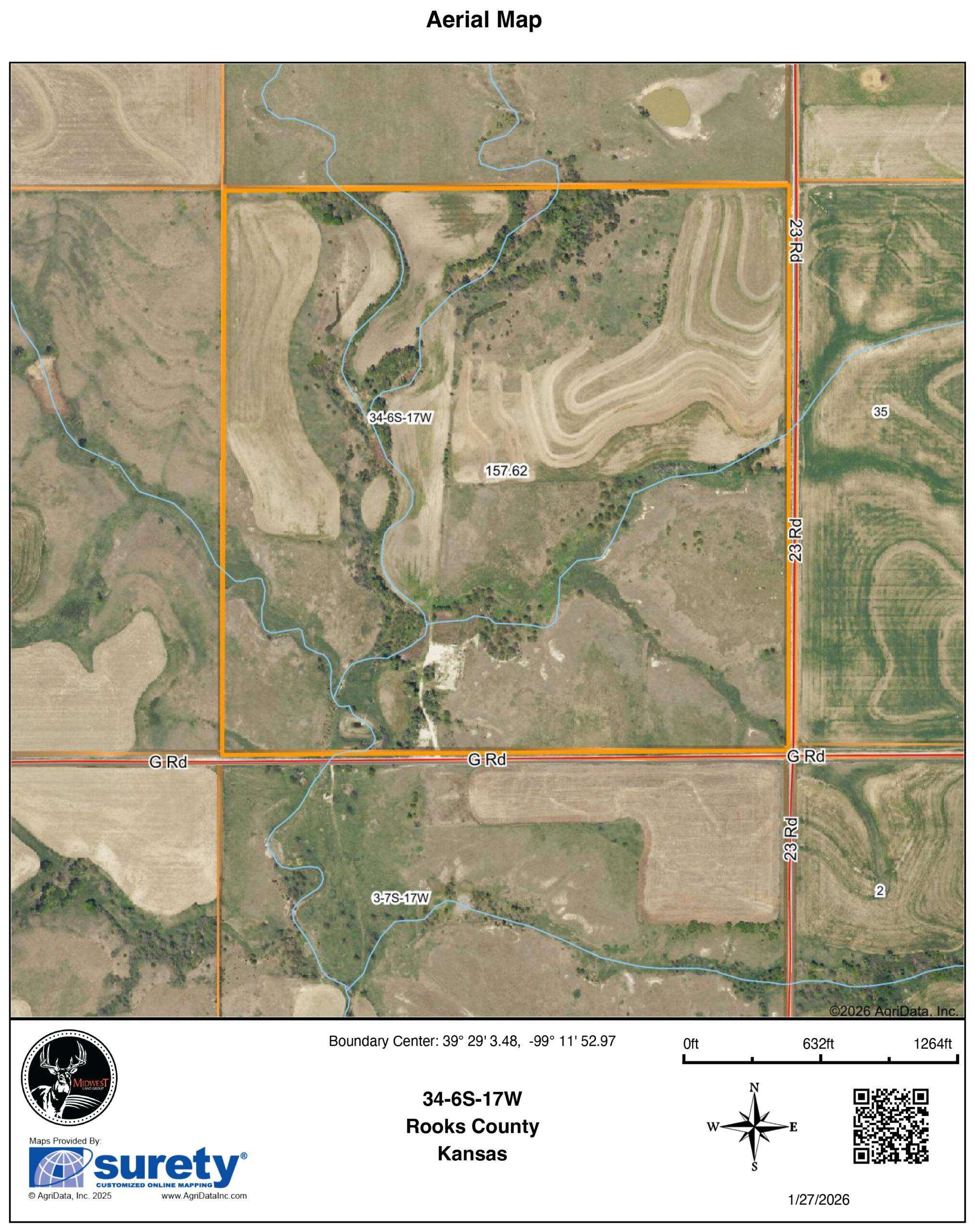 This quarter section is located in northeast Rooks County, Kansas, just outside of Stockton. It is fully turn-key and ready to be hunted this fall, with extensive habitat improvement projects completed in recent years. There are currently 54 acres in tillable production, with the remaining 104 acres in native grass and timbered draws. The timbered draws primarily consist of cottonwood, elm, and cedar trees along with reed-filled waterways. There is a new solar well that provides year-round water for wildlife and has been a major attractant during any hot or dry conditions. There is plenty of topography change creating great vantage and pinch points as well as seclusion from the road. Switchgrass buffers were recently planted around the boundaries and are expected to take off in the year to come. Electric and water are already on-site, with a large cleared pad ideal for building or parking a camper. The property has perimeter fencing, along with newly installed swing entry gates. Extensive dirt and terrace work was recently completed on the cropland, further improving the property. The current owner has this property in tip-top shape for the future owner. The property is frequented by whitetail deer, Rio Grande turkeys, pheasant, and quail. It is located in Kansas Deer Management Unit #3 and has qualified for two non-resident landowner tags. The property is being sold with blinds, feeders, and tree stands. This property truly has it all and is ready to be hunted this fall! Mineral rights are intact and are included with the sale. If you're looking for a bigger property, the quarter next door can be purchased as well. For additional information, disclosures, trail camera photos, or to schedule a showing, contact Cole Schumacher at (785) 656-1738.Property Features