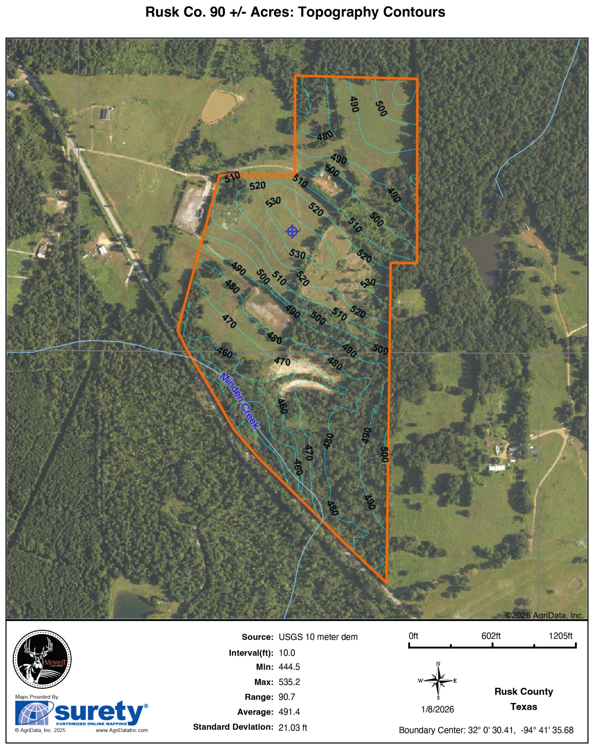 This 90 +/- acre tract in Rusk County, located in Henderson ISD, offers an outstanding opportunity for a horse ranch, cattle operation, or a beautiful rural homesite. Conveniently situated approximately 11 miles southeast of Henderson and 6 miles north of Mount Enterprise, the property provides a quiet country setting while remaining easily accessible. In addition to its agricultural potential, the land supports plenty of wildlife, with strong populations of hogs and whitetail deer, making it appealing for recreational use as well.The land features rolling hills with over 70 feet of elevation change, creating scenic views, excellent drainage, and numerous ideal homesites throughout the property. A balanced mix of open pasture and timber makes the tract both functional and attractive, while multiple natural springs add to the property’s character and long-term water potential. A partially finished large pond is already in place and offers the opportunity to be completed into a beautiful small lake.