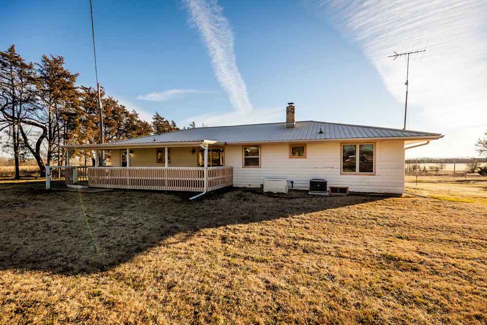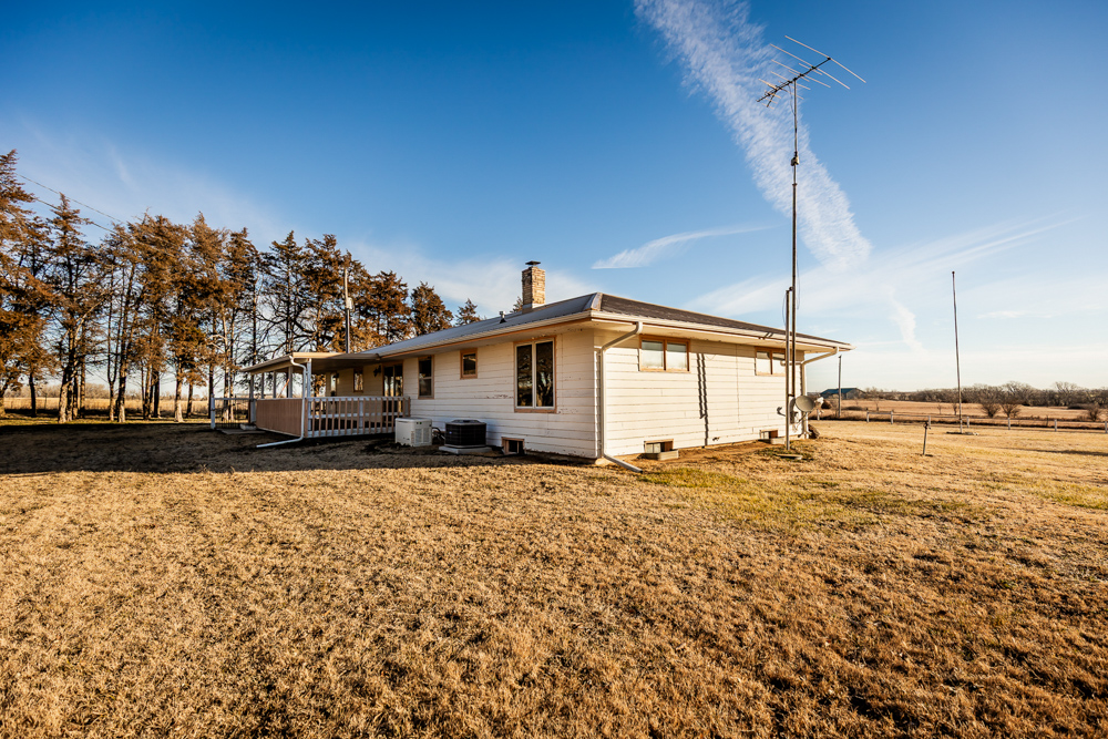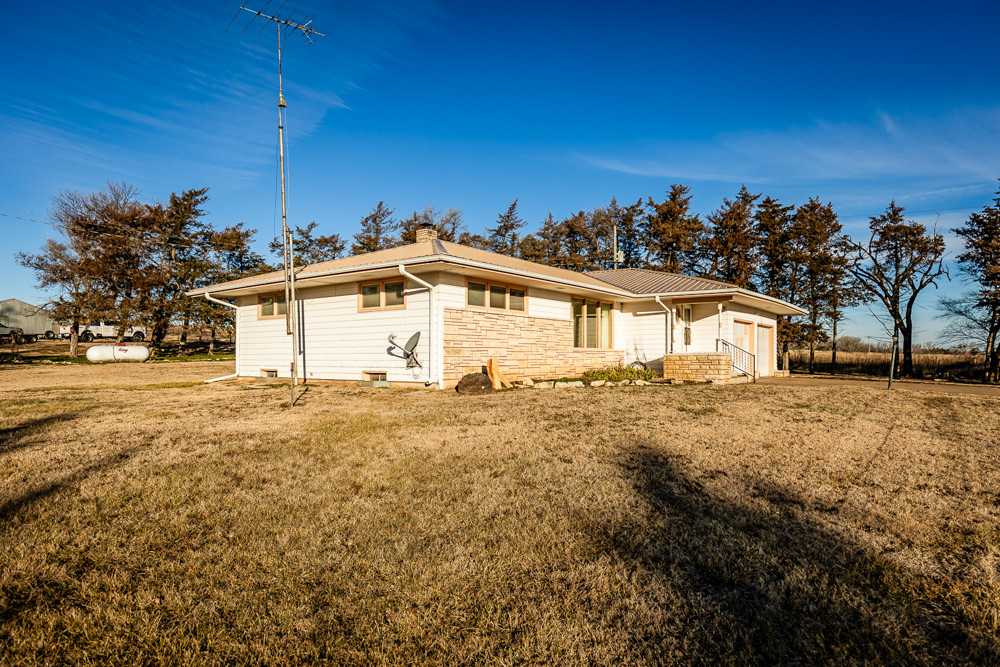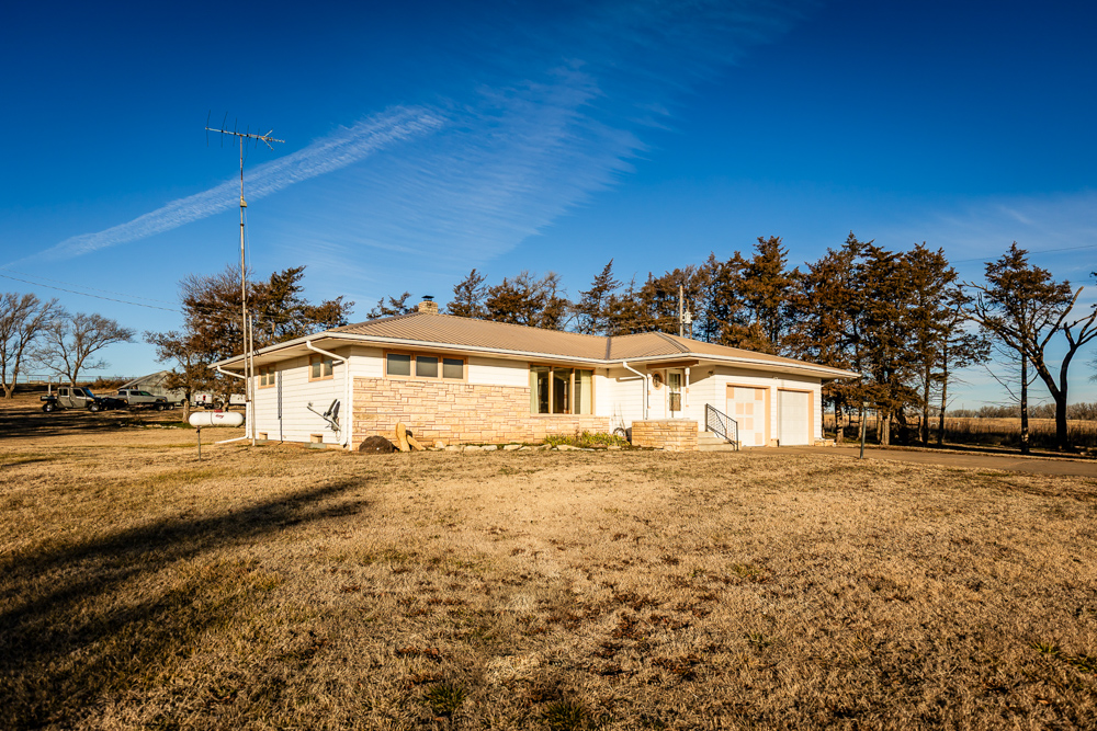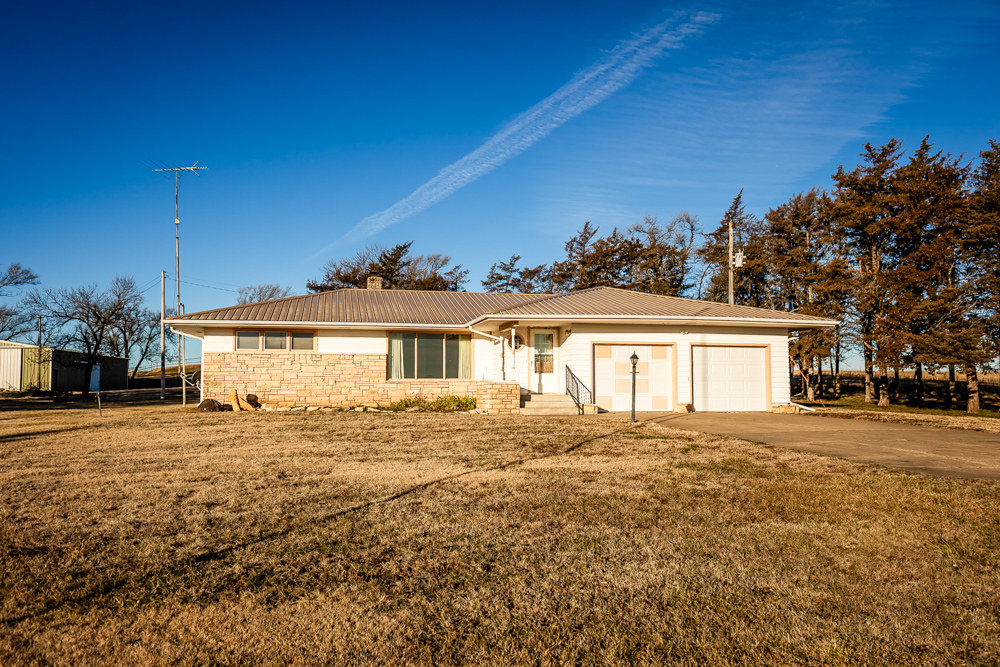 Located 10 miles northwest of Salina, Kansas, sits a home and shop on 13 +/- acres. Access to the property is provided by Hohneck Road, which is only 1.25 miles off a blacktop road and 4.5 miles from I-70, ensuring quick and clean access to and from the property. The home, built in 1963, consists of 1,416 finished square feet and has 2 bedrooms and 1 bathroom with an additional bonus/office room. The main floor also features a living room, kitchen/dining combo with lots of cabinet storage space, and a laundry room, which also has a shower and an additional sink. The home has a full unfinished basement, which is a great space for storage or could be finished out for additional living space. There is a two-car attached garage and a large covered rear porch, a great space for sipping your morning coffee, grilling, or catching a good sunset. The view out the front door to the east is beautiful and worth leaving the city for!