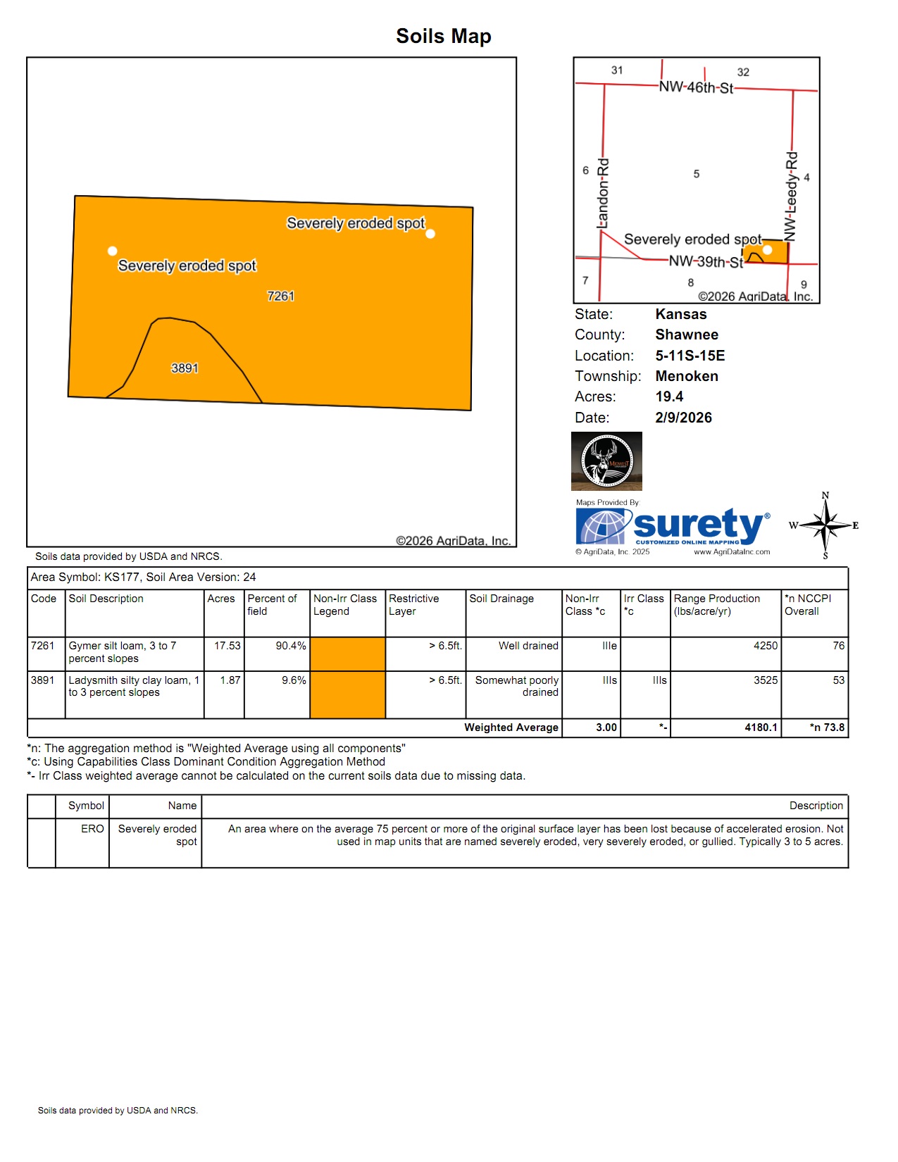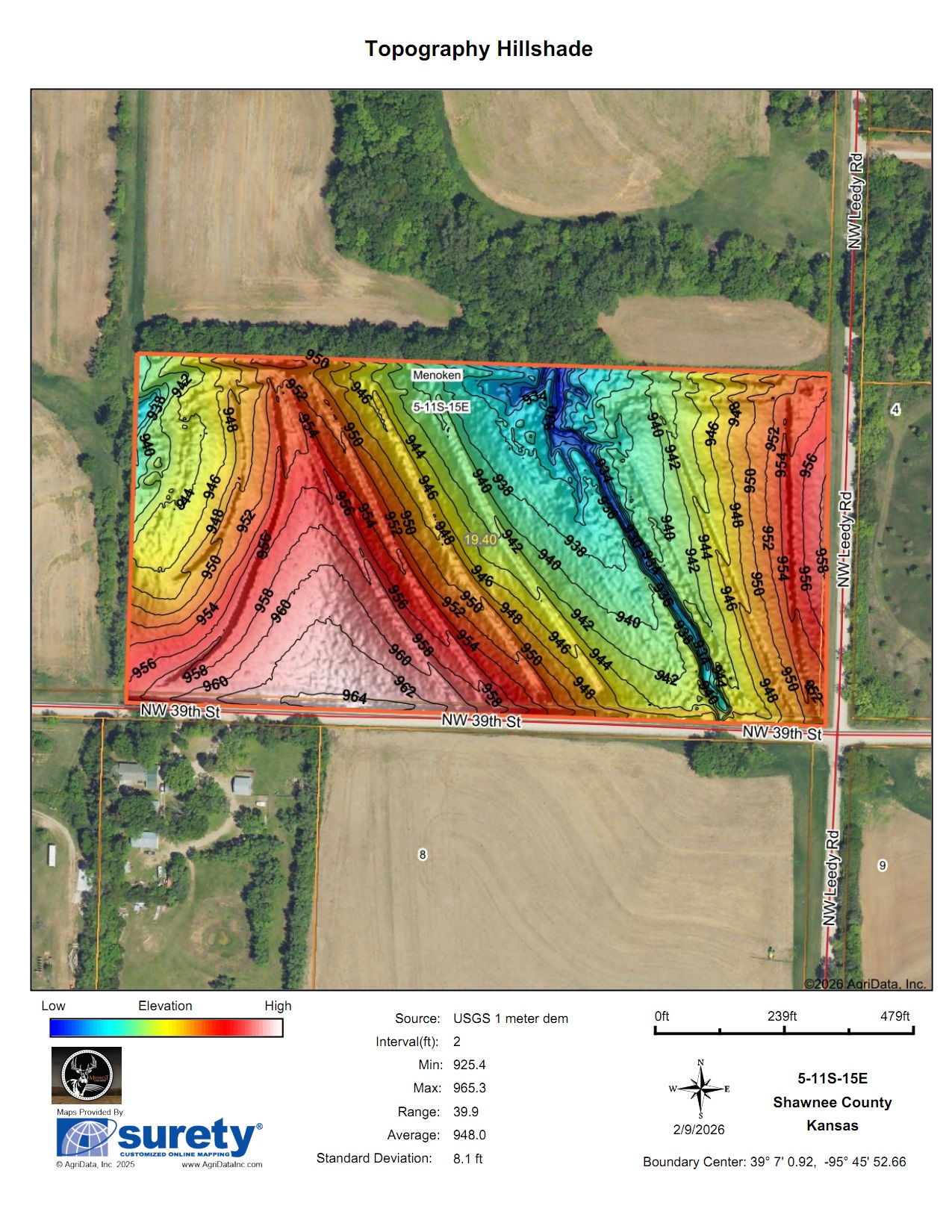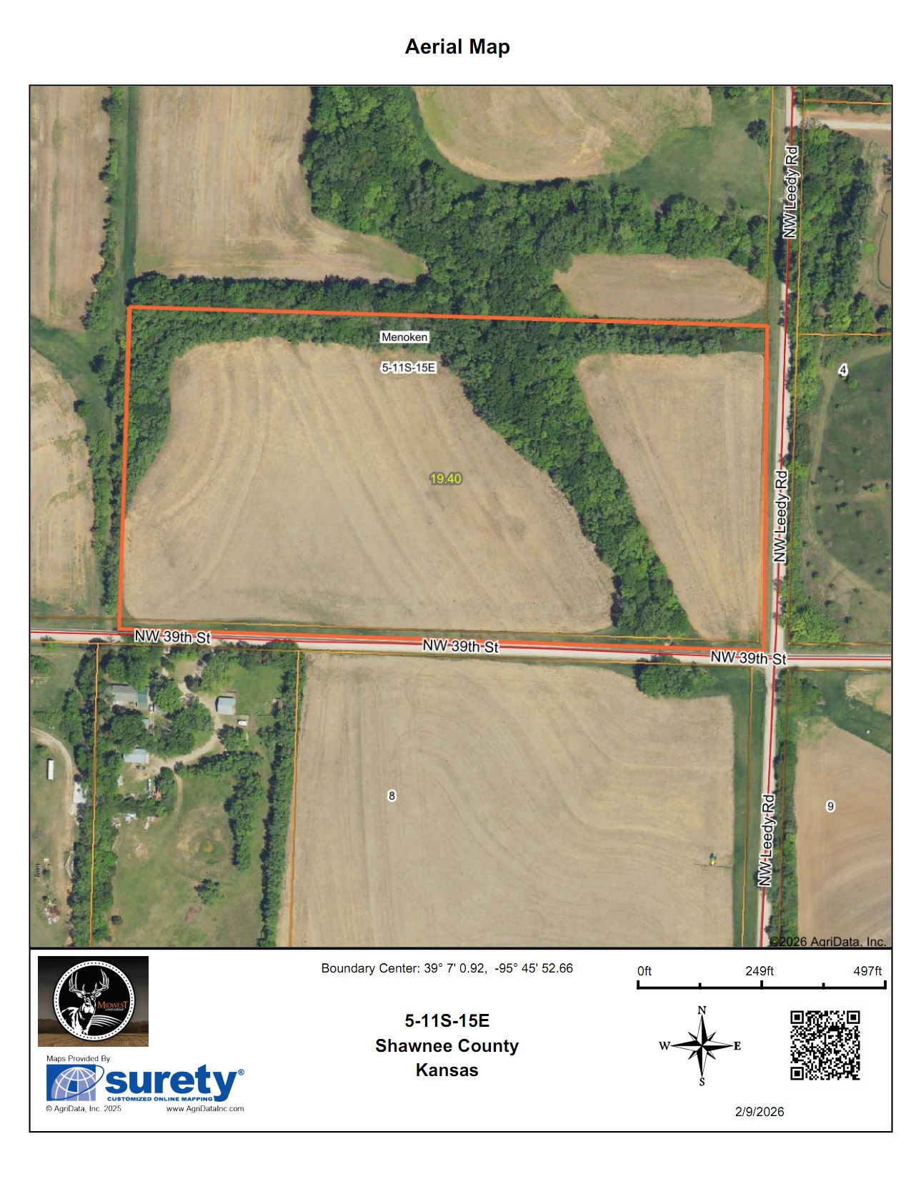 Located in northern Shawnee County just outside of Topeka, this property is prime for building, farming, or an investment hold in the Silver Lake school district. Sitting at the corner of 39th and Leedy Road, there are 2 sides of road frontage totaling roughly 1,900 feet. 14 +/-acres are currently in tillable production with a long-term tenant who would be happy to continue renting the farmground. The West and North boundaries are tree-lined with an additional timbered draw running through the property. The trees and a beautiful, gently rolling terrain offer a secluded feel while also having great access. There is a rural water line roughly 1,000 feet north of the property, and according to the water district, there are 2 meters available without doing a feasibility study. Estimated costs to run the line to the property are $10,000-$15,000, with the cost of the meter being an additional $5,000. This property provides the unique opportunity to have a secluded feeling homesite with incredible proximity to all of the amenities that Topeka has to offer, and access to both 24 Highway and 75 Highway within 5 minutes. Silver Lake is a 12-minute drive, while downtown Topeka is 19 minutes. Taxes in 2025 were $396.92, and the property sits in section 5, township 11, range 15. Call Joey Purpura at (785) 831-3045 for maps, disclosures, or to schedule a showing.