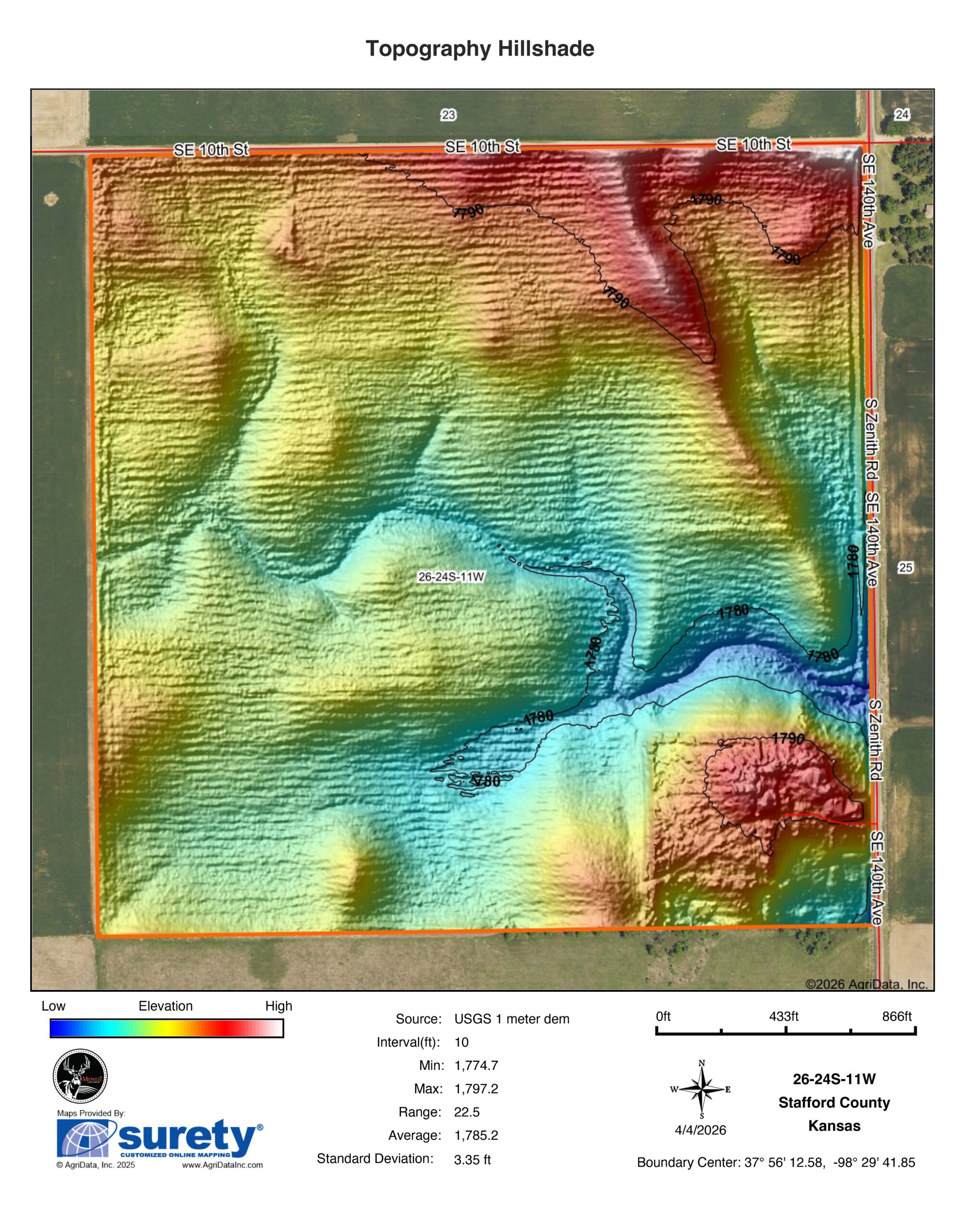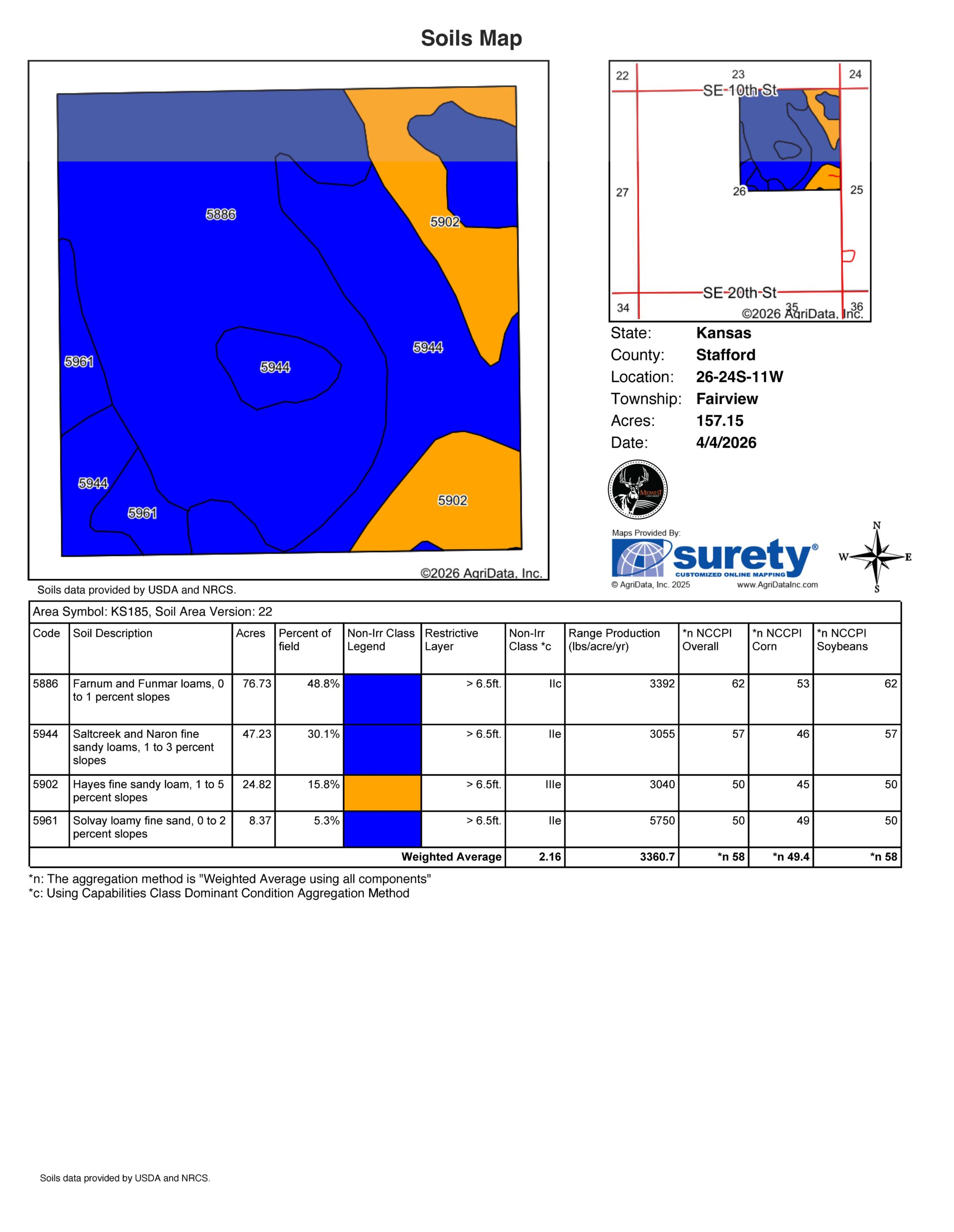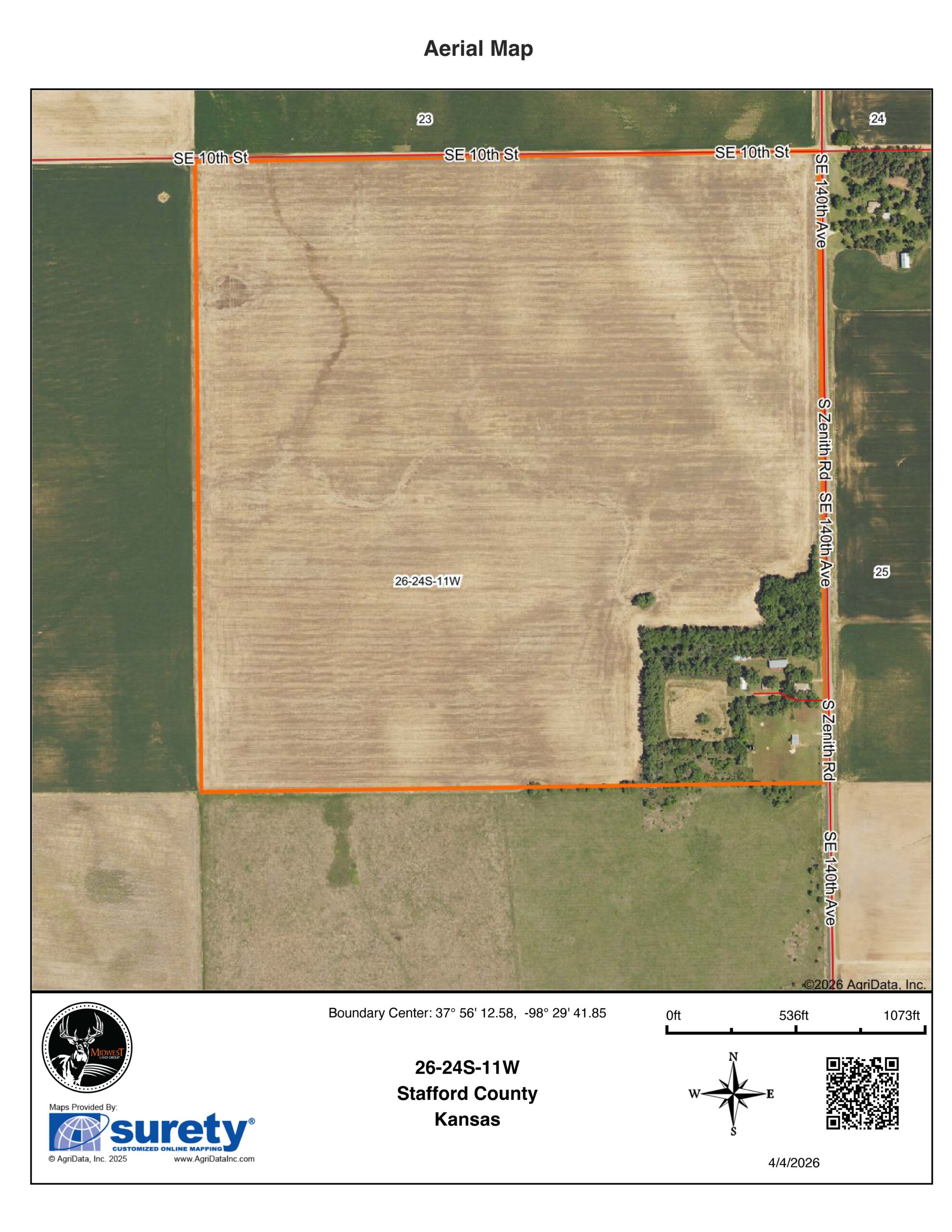 This 156.88 +/- acre property, just 1 mile south of Zenith and Highway 50, offers a well-rounded opportunity with productive farmland, a solid farmhouse, and a full set of improvements already in place. With approximately 145 +/- acres of tillable ground and a home sitting on 12 acres, this is a setup that works equally well for an operator looking for a headquarters location or someone wanting to live on and manage their own land. The farm lies mostly flat and is made up primarily of Class II Farnum and Funmar loams, along with Class II Saltcreek and Naron fine sandy loams. With an NCCPI of 58.49, it has a strong track record for production. Currently on a 1/3–2/3 crop share, the property provides income potential, with possession available after the 2026 wheat harvest or August 1, whichever comes first. Blacktop frontage along County Road 140 Avenue makes access simple and efficient, and the property sits just a mile from the Zenith elevator and 7 miles from Stafford.