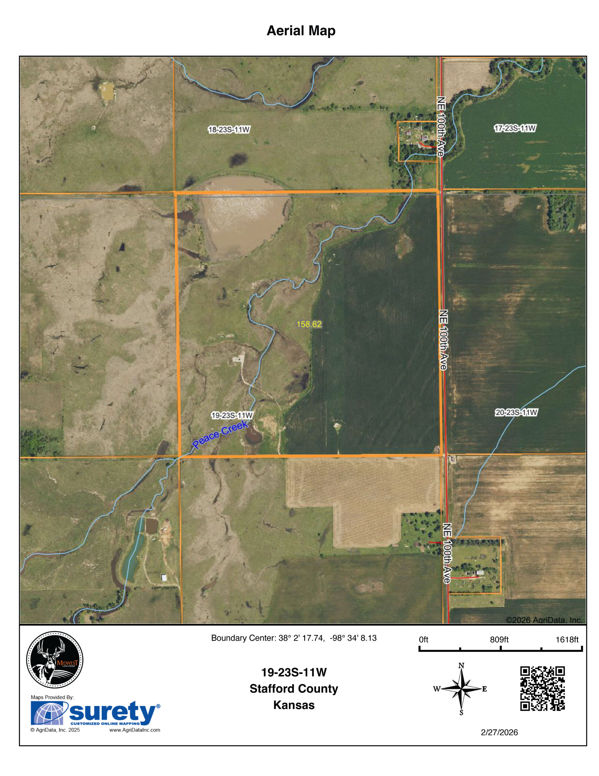 Located just 4 miles from the renowned Quivira National Wildlife Refuge and positioned directly along a highly imprinted waterfowl flyway, this property offers a perfect combination of farm and oil income production with prime waterfowl habitat. Properties in this immediate area are highly sought after due to their proximity to one of the most important migration corridors in the Central Flyway, making this an exceptional opportunity for both investors and avid hunters.The farm features approximately 70.96 acres of productive dryland currently planted to wheat, providing dependable agricultural income as well as attractive feed for local wildlife. Complementing the cropland are 87.65 acres of native pasture, enhanced by a marshy lowland area that naturally holds water. A reliable 10-acre pond and the presence of Peace Creek further elevate the property’s wildlife appeal, offering year-round water sources that attract ducks, geese, and other game.