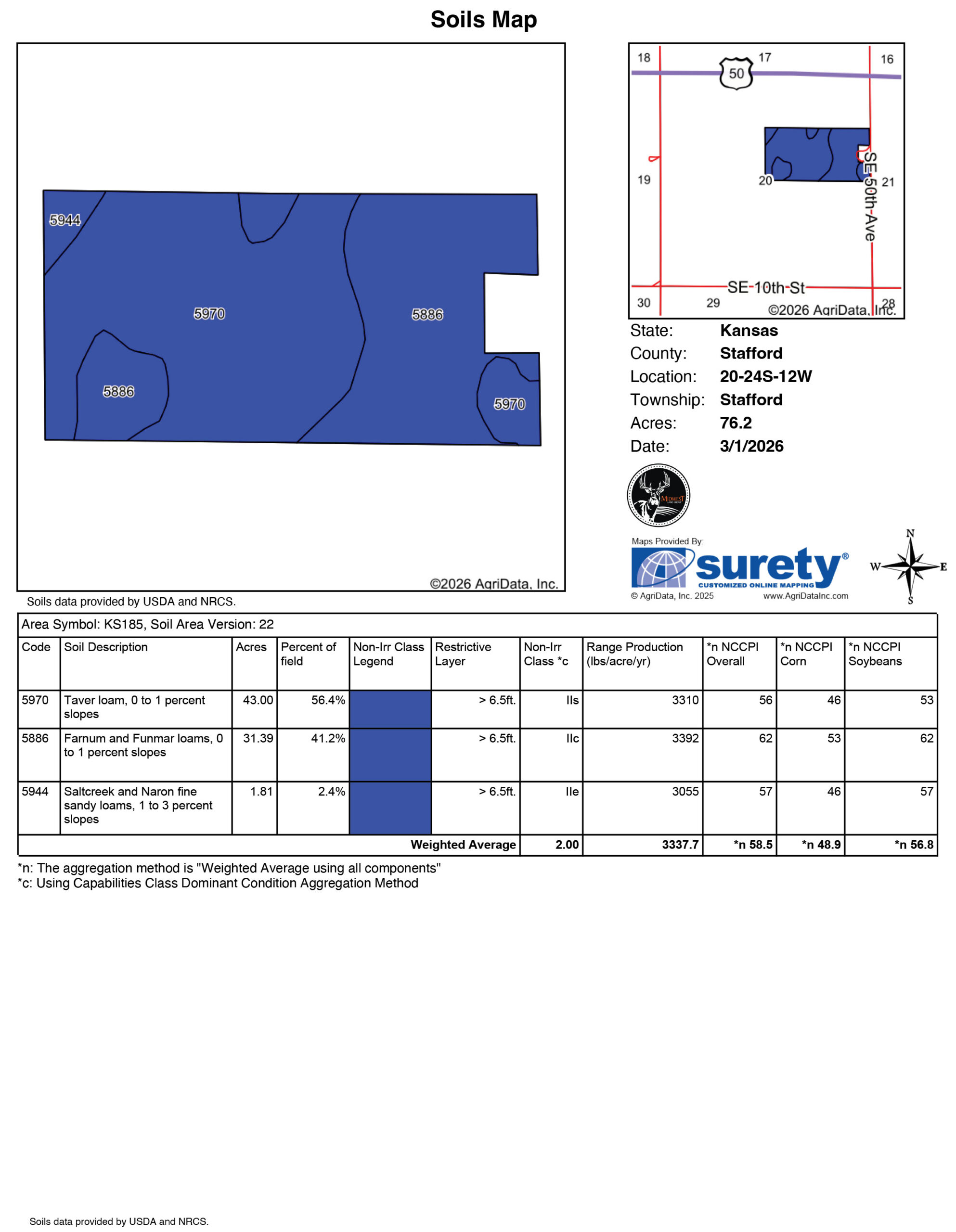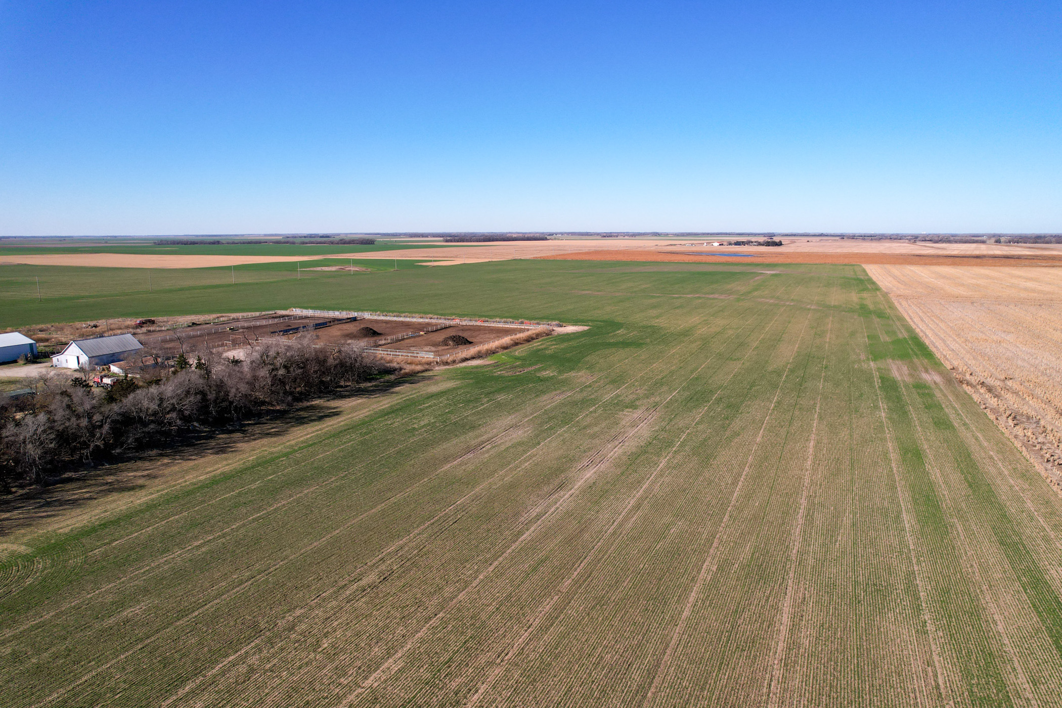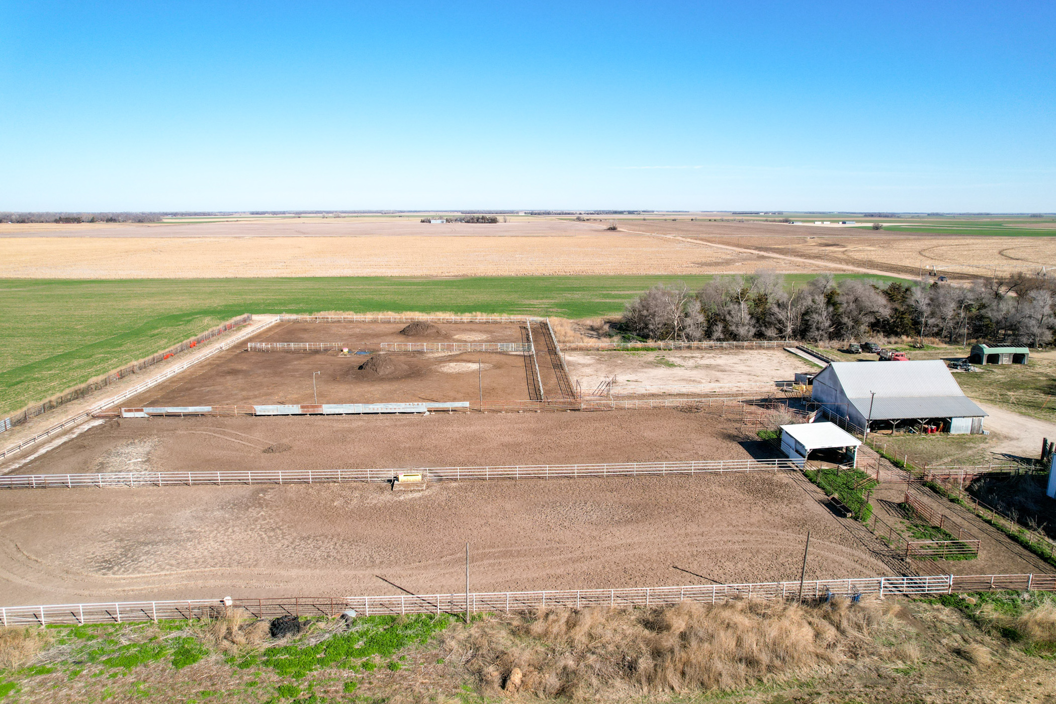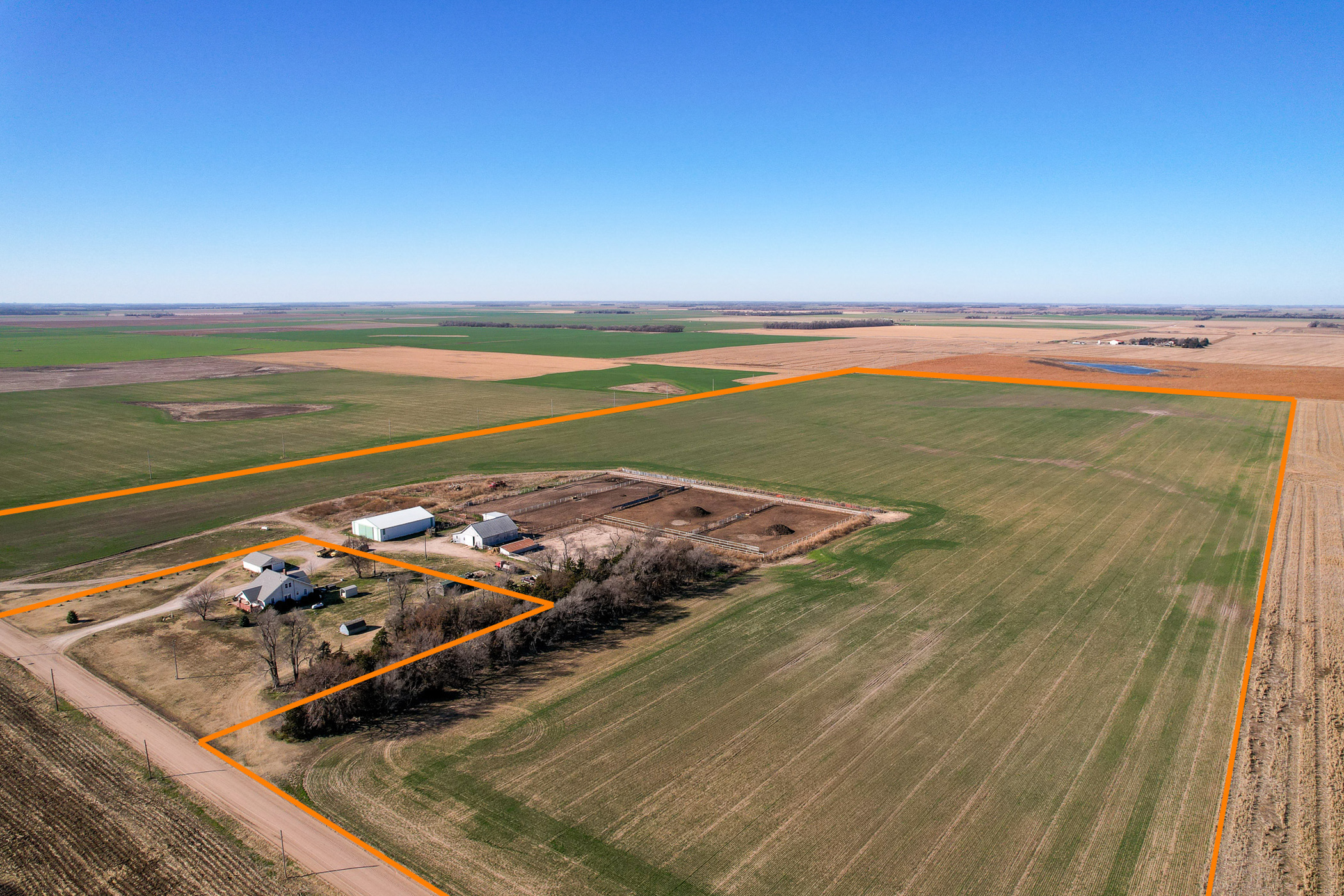 Located in the south half of the northeast quarter of Section 20, Township 24 South, Range 12 West, this 76.2-acre tract offers a rare combination of productive farmland and a fully functional, turn-key cattle facility, creating an exceptional opportunity for both operators and agricultural investors.Approximately 70 acres of flat, highly productive farmland provide a reliable annual income through a year-to-year cash rent lease at $80 per acre. The dryland acres are currently planted to wheat, with the 2026 lease payment to be prorated to the buyer at closing, allowing the next owner to step into immediate income.