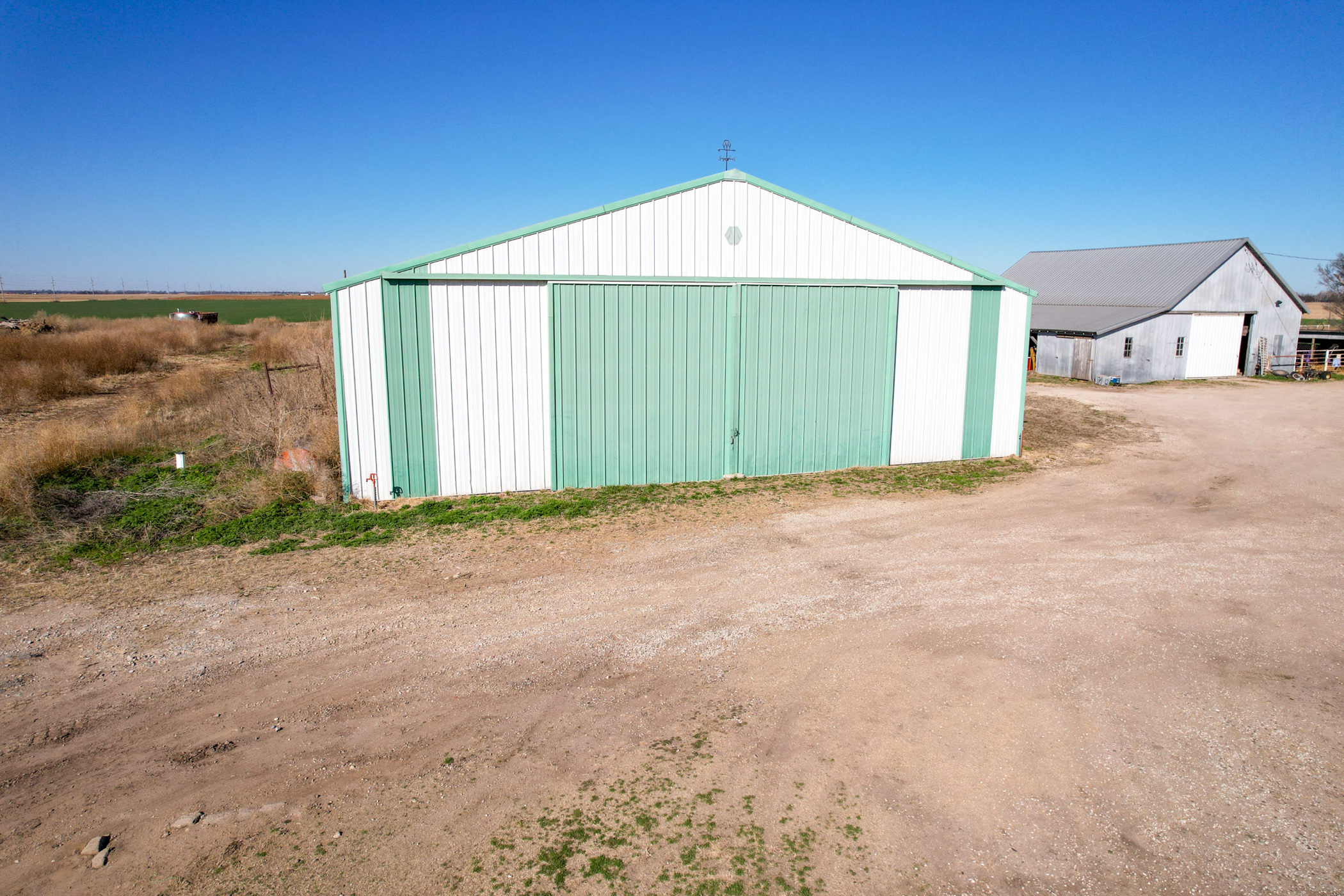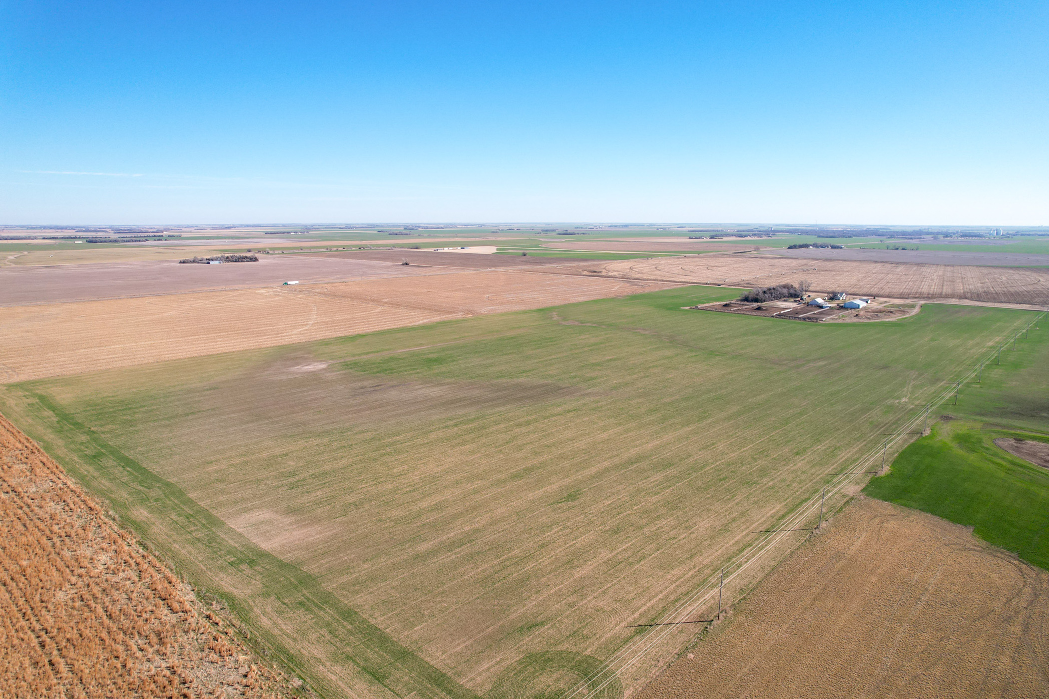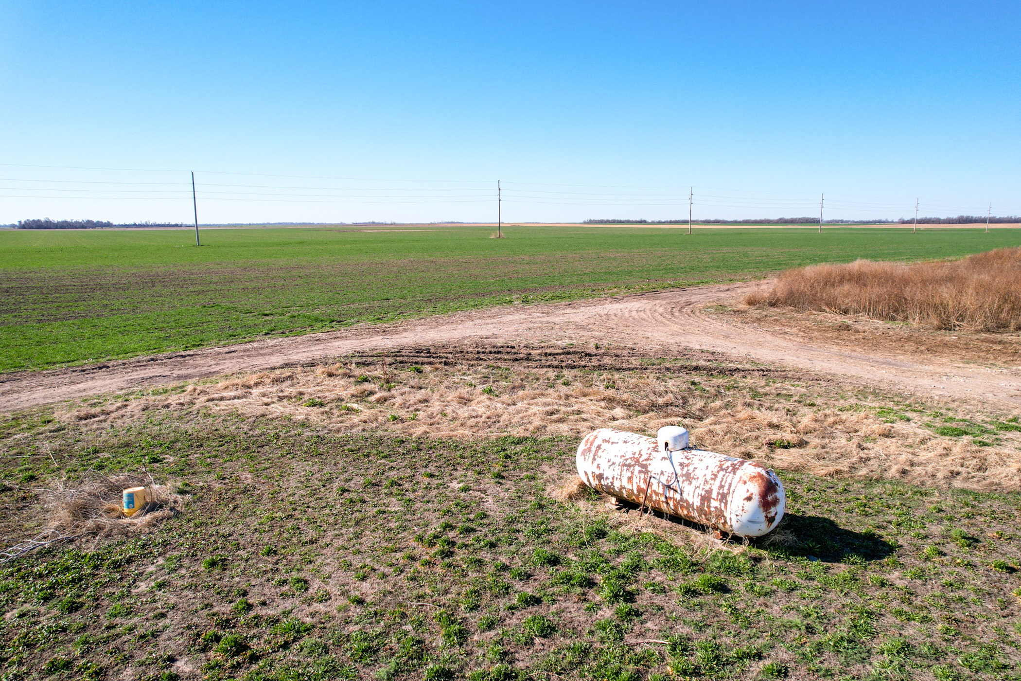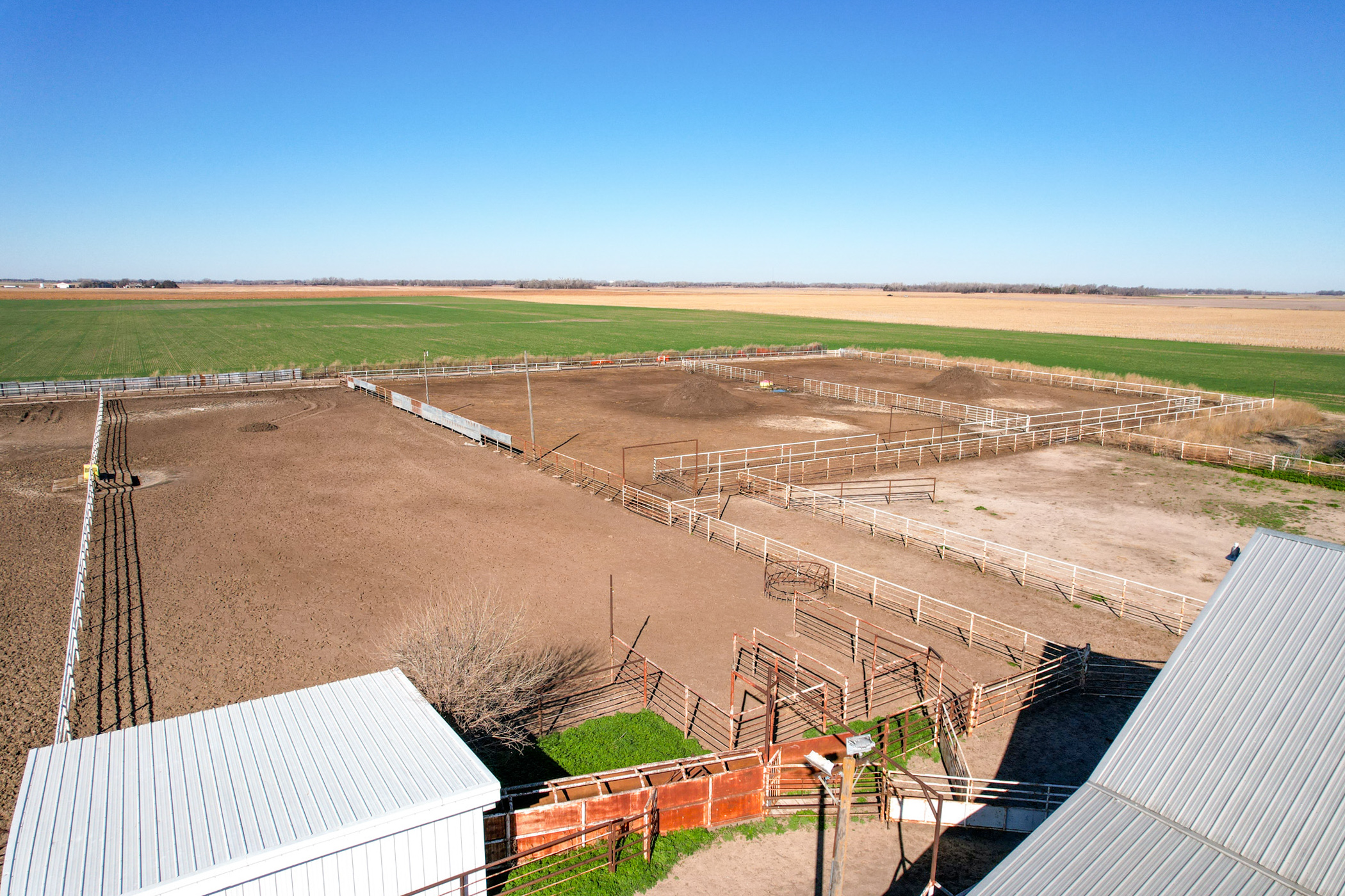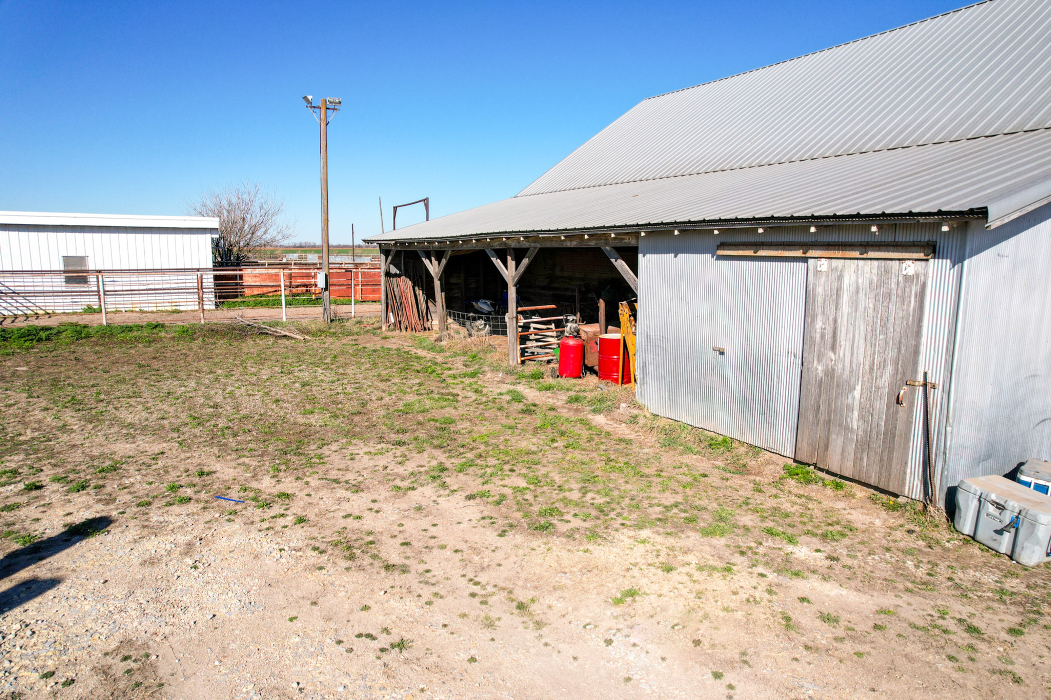 Complementing the cropland is a well-designed, highly efficient cattle yard capable of supporting and feeding up to 500 head. The facility has been thoughtfully developed for functionality and ease of use, making it ready for immediate operation. Improvements include a 54'x70' Morton machine shed with electricity, a 34'x50' barn with a concrete floor, a livestock lean-to shed, and a centralized doctoring facility positioned within the cattle pens for streamlined livestock handling. Southeast of the machine shed, the property is equipped with laterals, a propane hookup, and a water well, along with a prepared site ideal for placing a camper or trailer. This area provides convenient utility access, offering flexibility for options such as living quarters, additional storage, or operational use tied to the cattle facility.