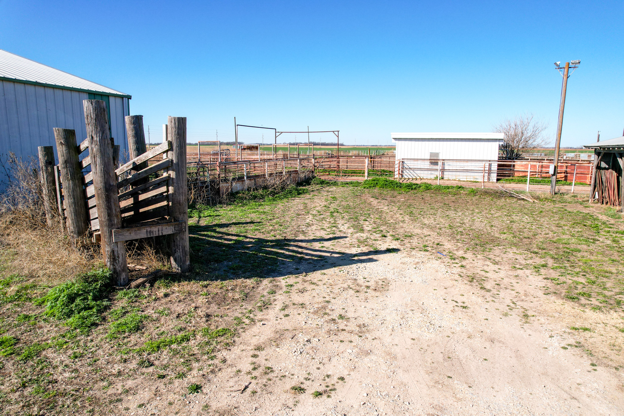 The cattle lot is equipped with concrete fence line feed bunks along both the east and west fence boundaries, three automatic waterers, and lighting within the pens, providing both convenience and operational efficiency. The doctoring building features concrete floors, electricity, and space for a squeeze chute, creating a practical working facility designed with cattle management in mind.