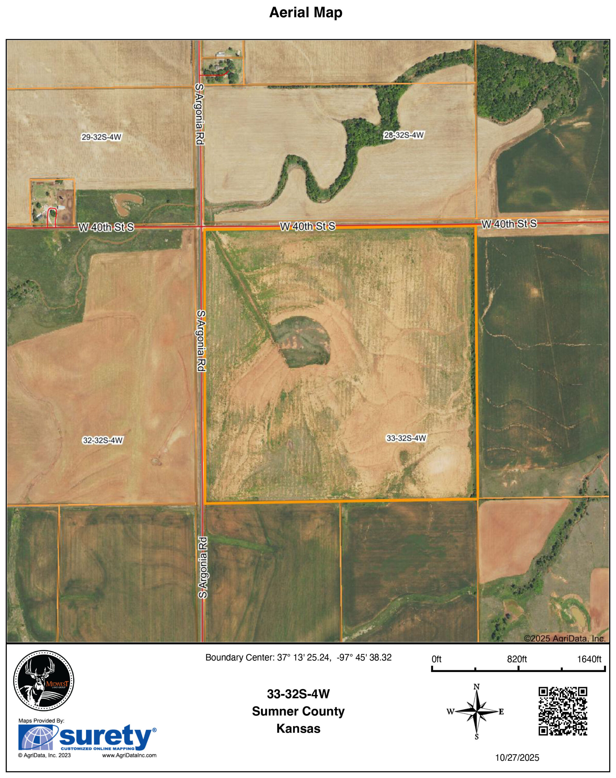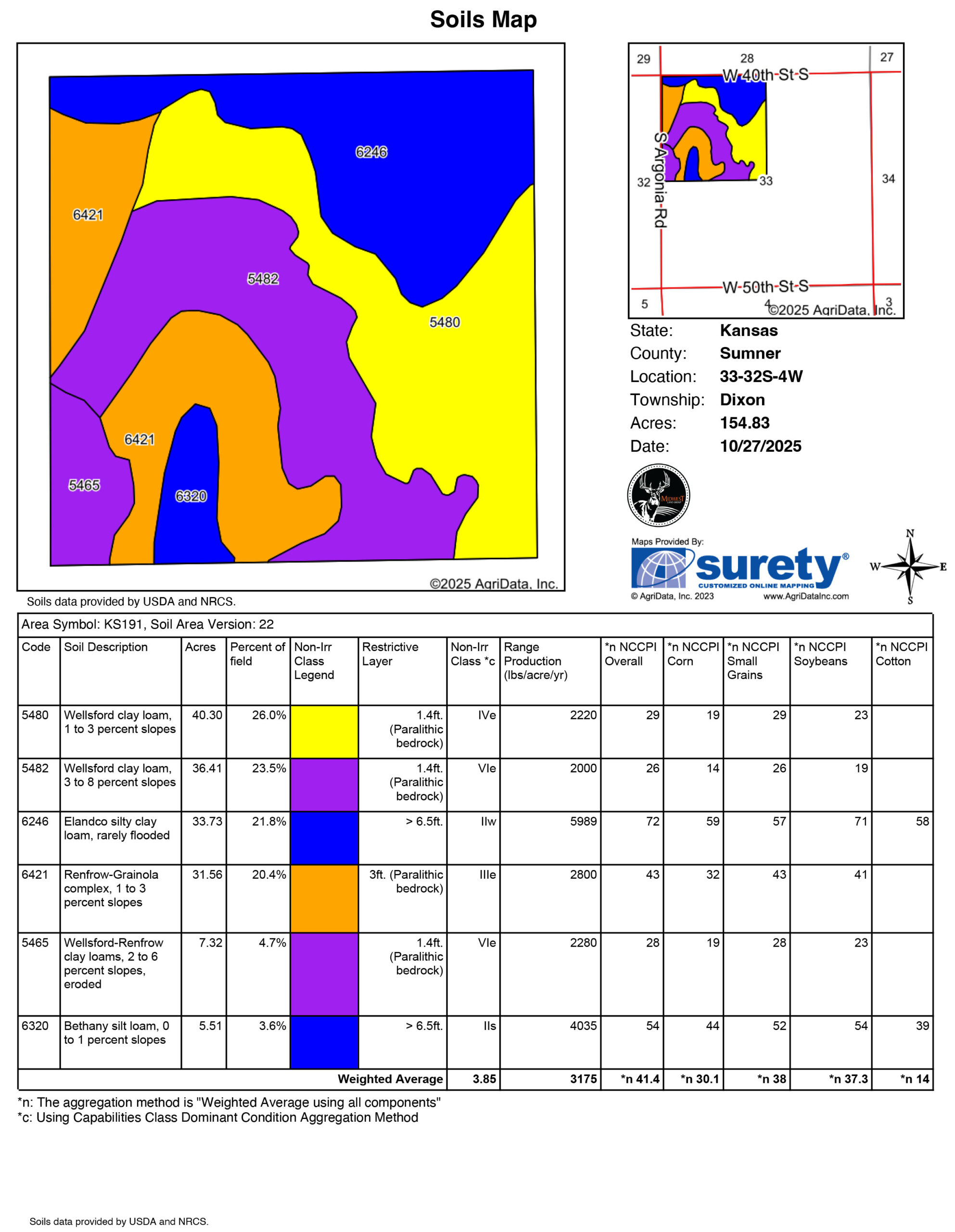 Just south of Argonia, Kansas, sits a great investment opportunity for 155 +/- acres in Sumner County, Kansas. The west side of this farm is supported by a nice paved road with power up and down Argonia Road. This gives anyone quick access to reach HWY 160 or a straight shot north to HWY 42 into Wichita. Great topography across this farm and stunning views will give any future buyer the option to build for views off the paved road or a nice, quiet spot off the gravel road. The right topography is in place for a future owner to build a lovely pond to improve the property.The farm itself is nearly 141 acres of tillable land that raised a great crop of soybeans this year. The farm has a mix of Class II, III, and IV soils, bringing the farm's average NCCPI Score to 41.4. The east property line does have a nice waterway that is supported by several young growing trees and creates a nice travel corridor for deer moving up out of the neighboring river bottom. The farm provides nice passive income and an opportunity for someone to build out in the country. The farm is also an excellent candidate for a cattle operation that is looking for grazing wheat pasture or springing and turning back to a full-time pasture. To schedule a showing or answer any questions, please call Listing Agent Tyler Heil at (913) 207-4541.