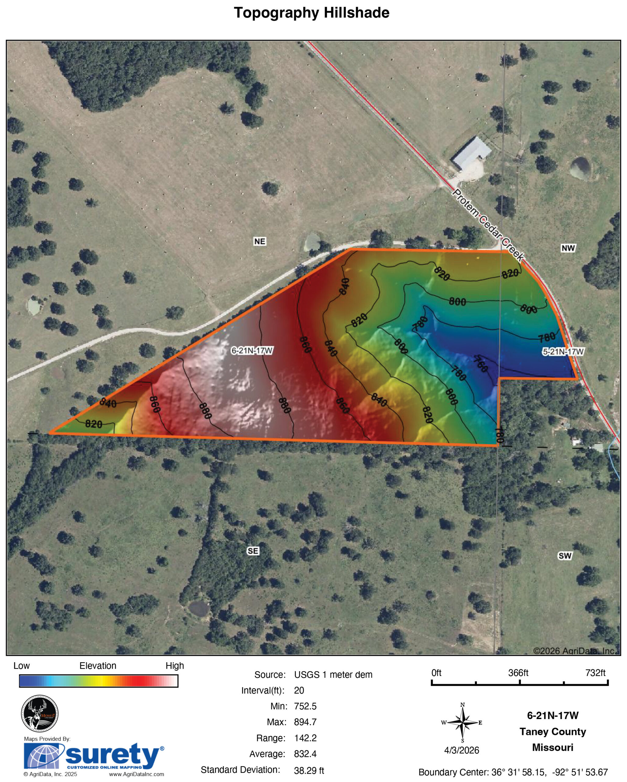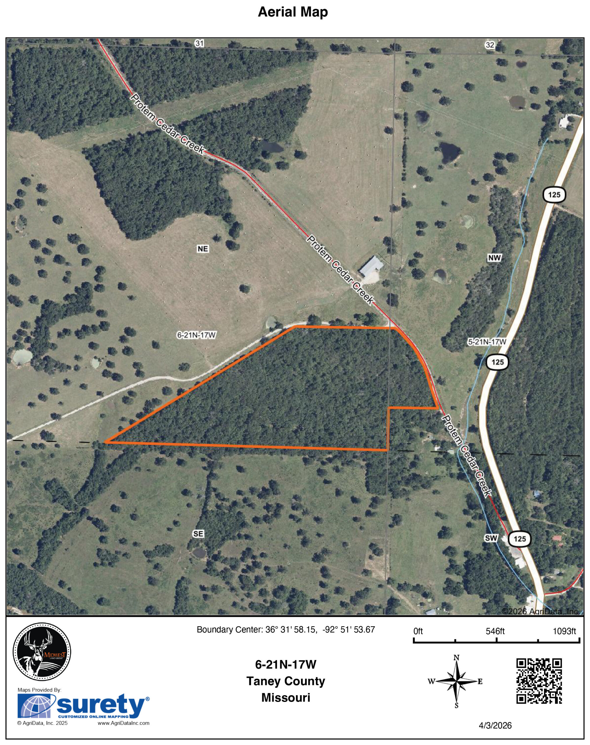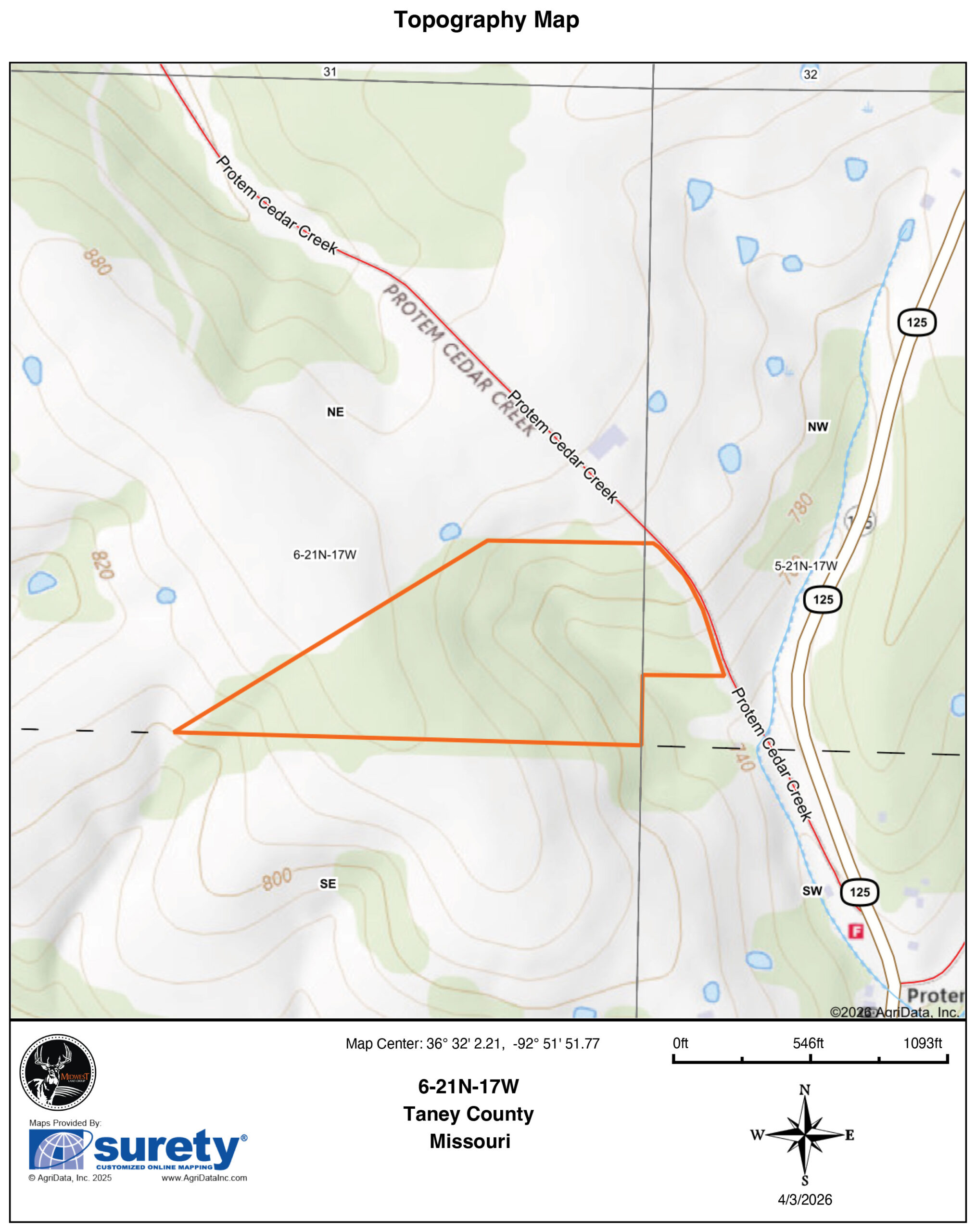 Located just outside Protem, Missouri, this 25.7-acre all-timber tract offers a secluded Ozarks setting with excellent recreational appeal and multiple possibilities for future use. Covered in mature hardwood timber with rolling topography, this property delivers the privacy and natural beauty buyers seek in southern Missouri. A wet-weather creek winds through the land, adding character, wildlife attraction, and that classic Ozarks landscape feel. The wooded terrain creates outstanding habitat for deer and turkey, making this an excellent hunting retreat, while also offering several scenic locations for a cabin or private homesite tucked into the trees. Conveniently located near Bull Shoals Lake and the outdoor recreation opportunities the area is known for, this tract is ideal for anyone looking for a manageable hunting property, weekend getaway, or peaceful place to build in the heart of the Ozarks.