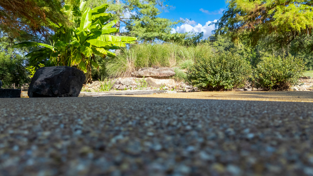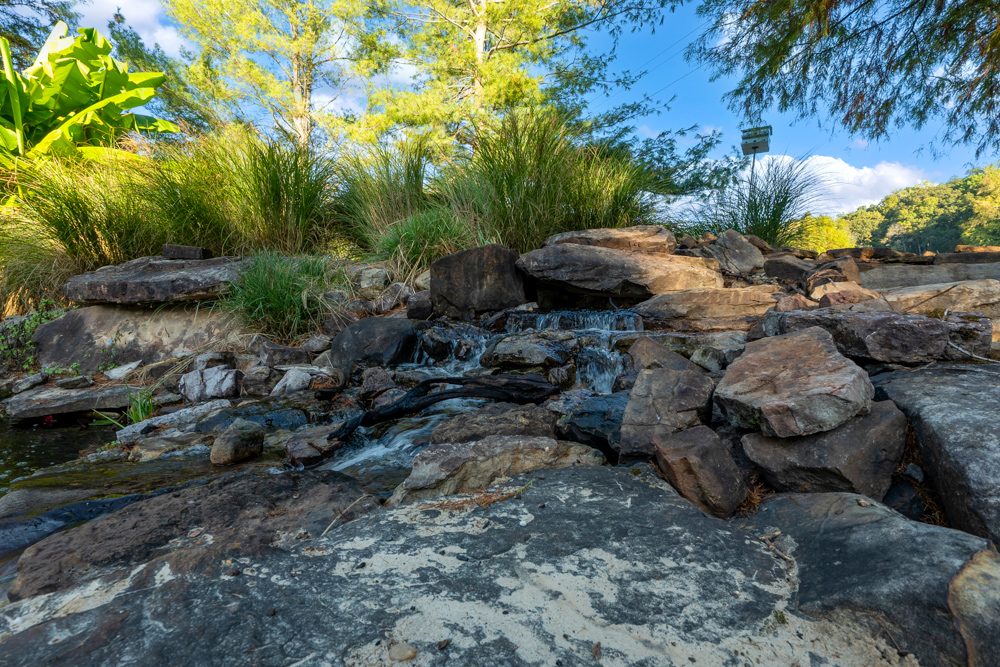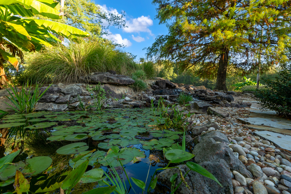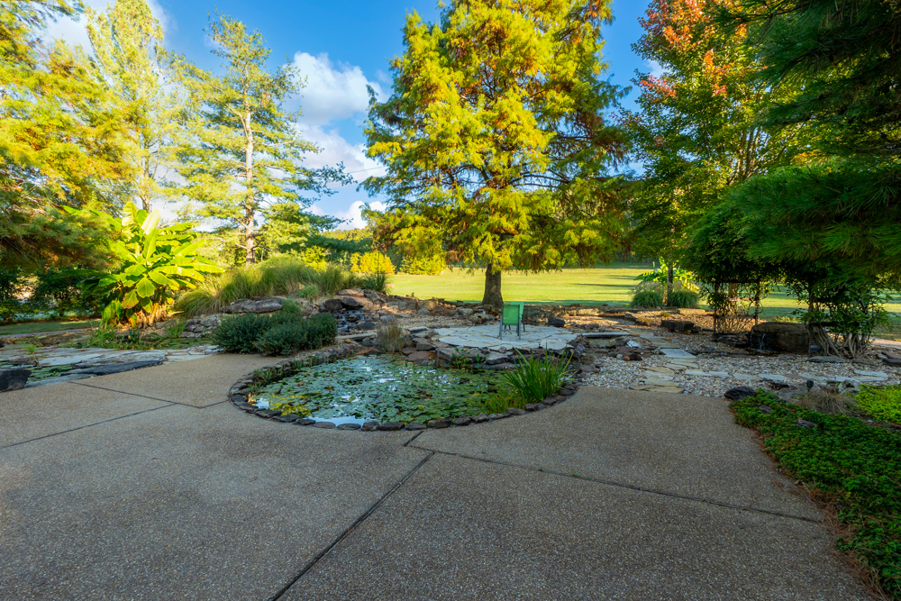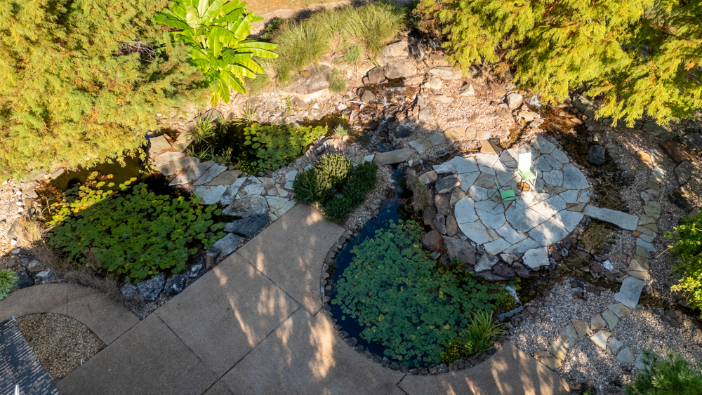 - Large outdoor patio and sitting area with koi ponds, streams, and waterfall features