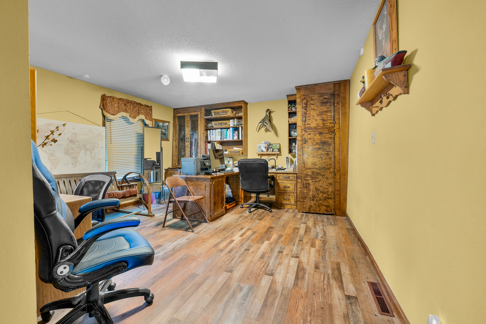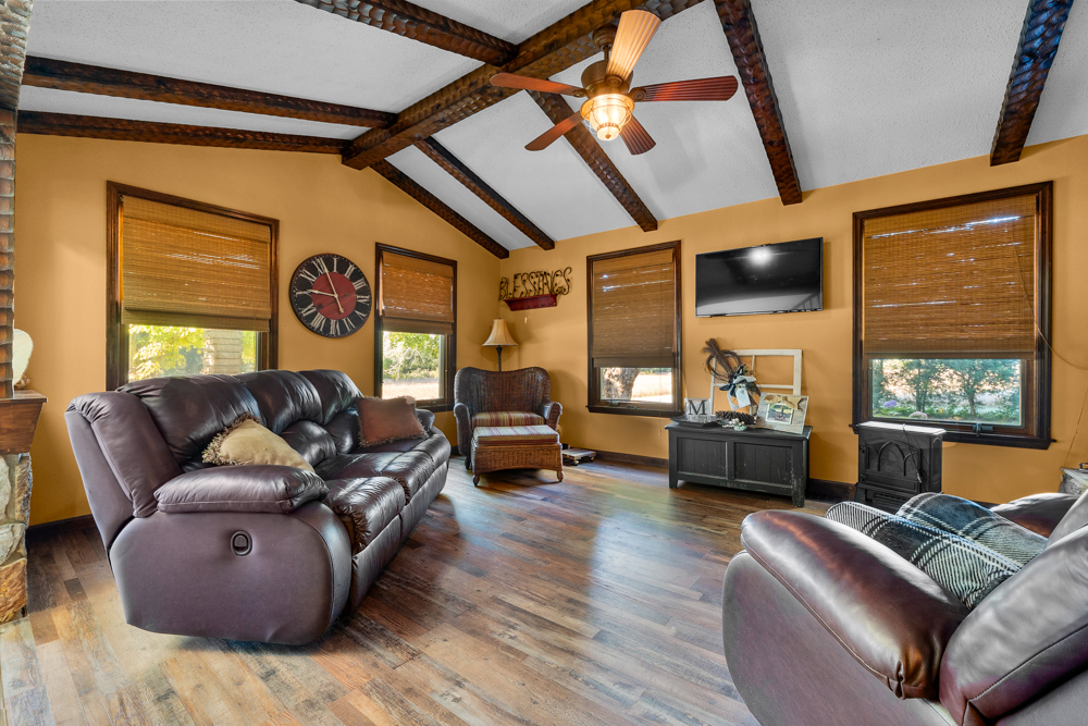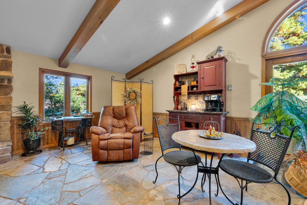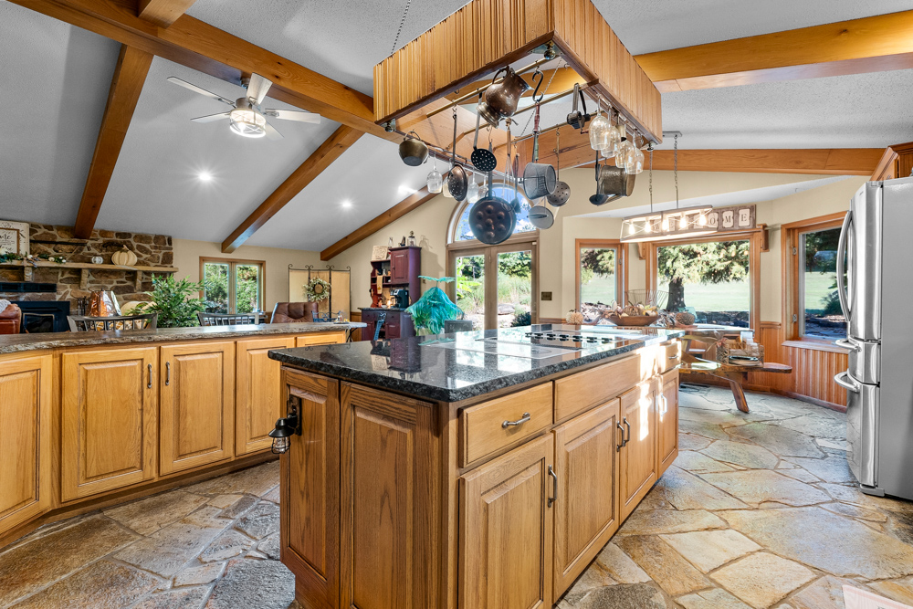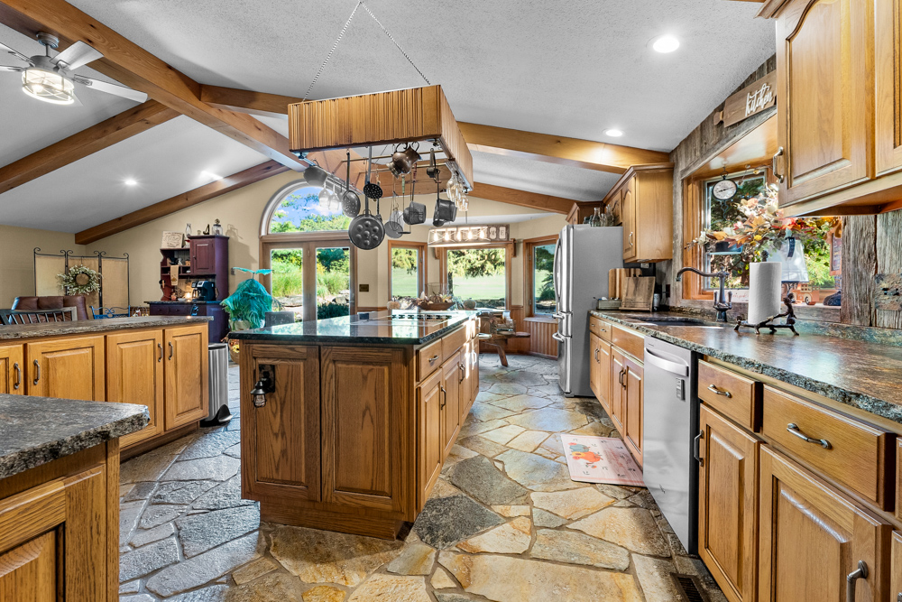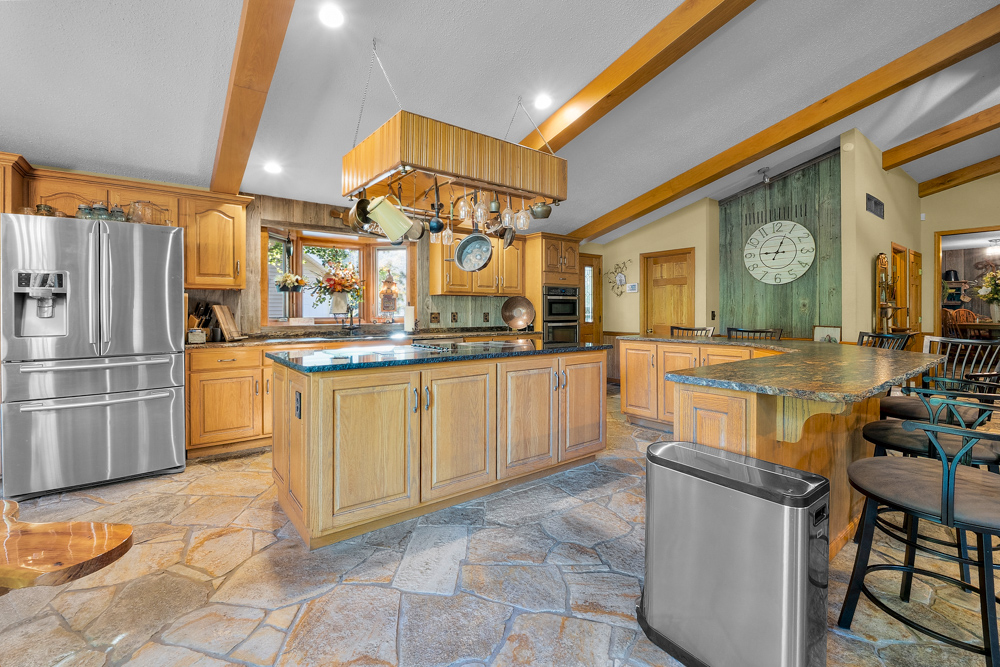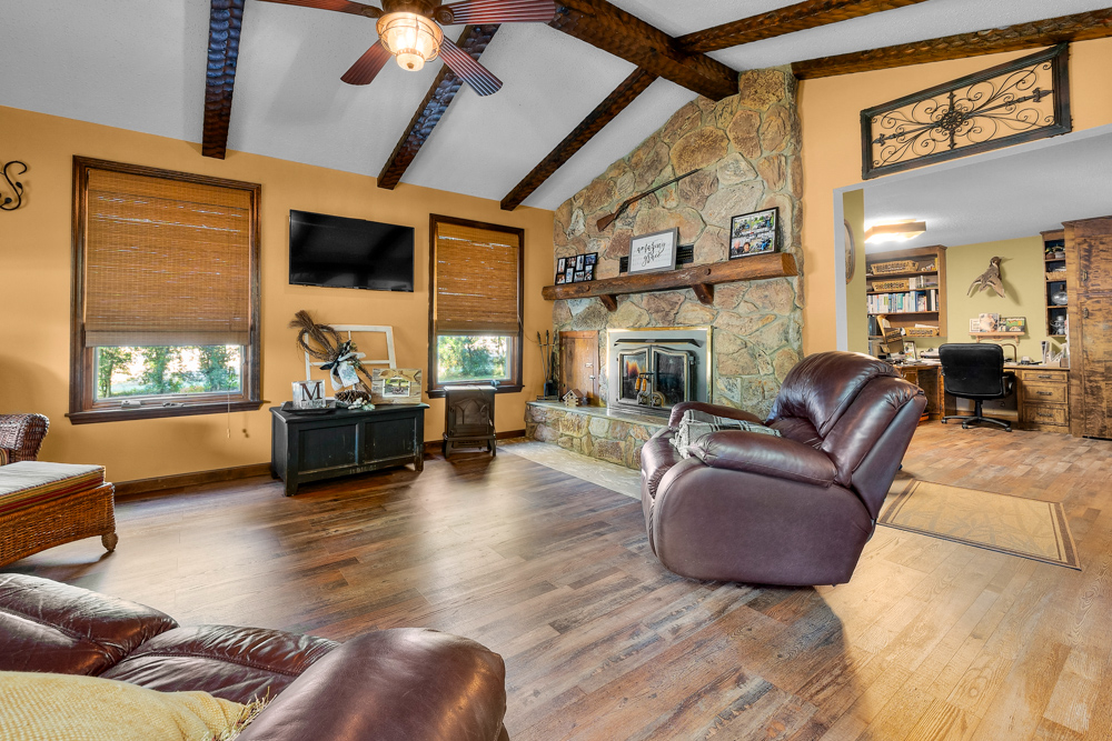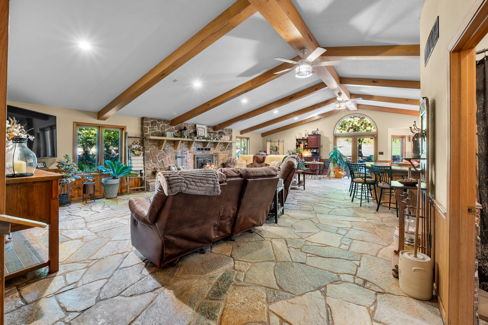 The home boasts approximately 3,800 square feet of custom high-end touches that are tastefully rustic and extremely well done. As you enter the great room, you will fall in love with the natural stone fireplace that encompasses the entire wall and includes a custom barn wood firebox. The floors are gorgeous natural stone that span the entirety of this main floor. This open concept room includes a large kitchen area and is the perfect marriage of high-end touches. The granite countertops are highlighted on the very large entertaining island that seats 6, while the cooking island allows you to interact with guests while preparing meals. Off the side of the island area is a spacious dining area with a beautiful view through the picture windows looking out to the patio area. A step up from the great room takes you into a perfect private dining area surrounded by barn wood wainscoting. Onward takes you to another sitting area and a gorgeous fireplace! The theme of natural stone and rustic feel continues throughout this level. The main
