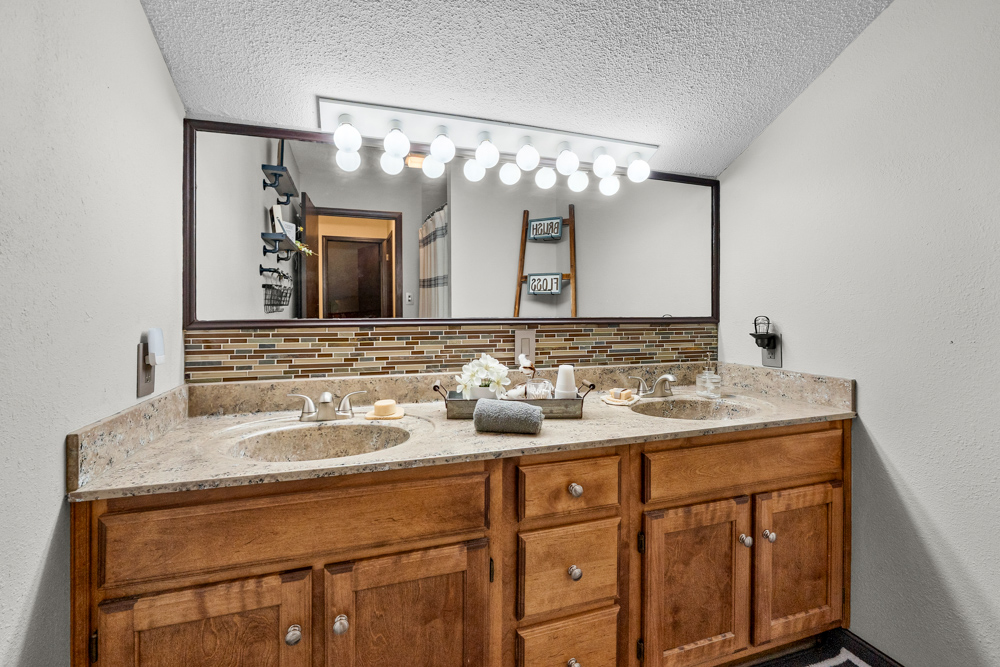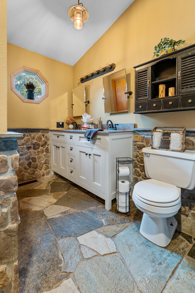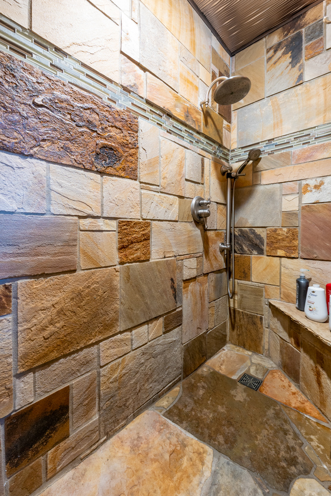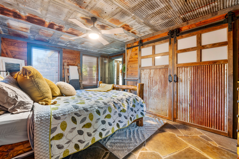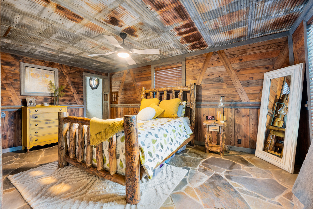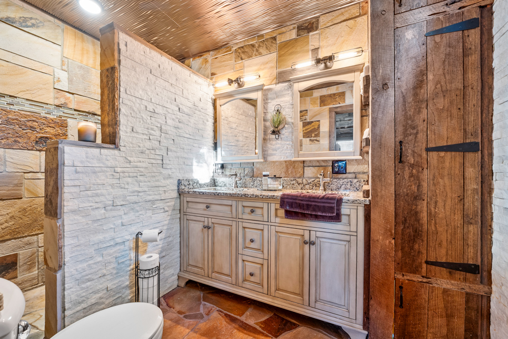 floor is complete with a laundry room, office, full bath off the great room, and a master suite with another full bath. The master suite is as rustic and cozy as it gets. With reclaimed barn wood, rustic barn tin, and natural stone work in the master bath, this is a must-see master area! Upstairs features 4 more bedrooms and a full bath! Perfect for hosting guests and family. This whole level of space provides plenty of privacy and space for your family or guests.