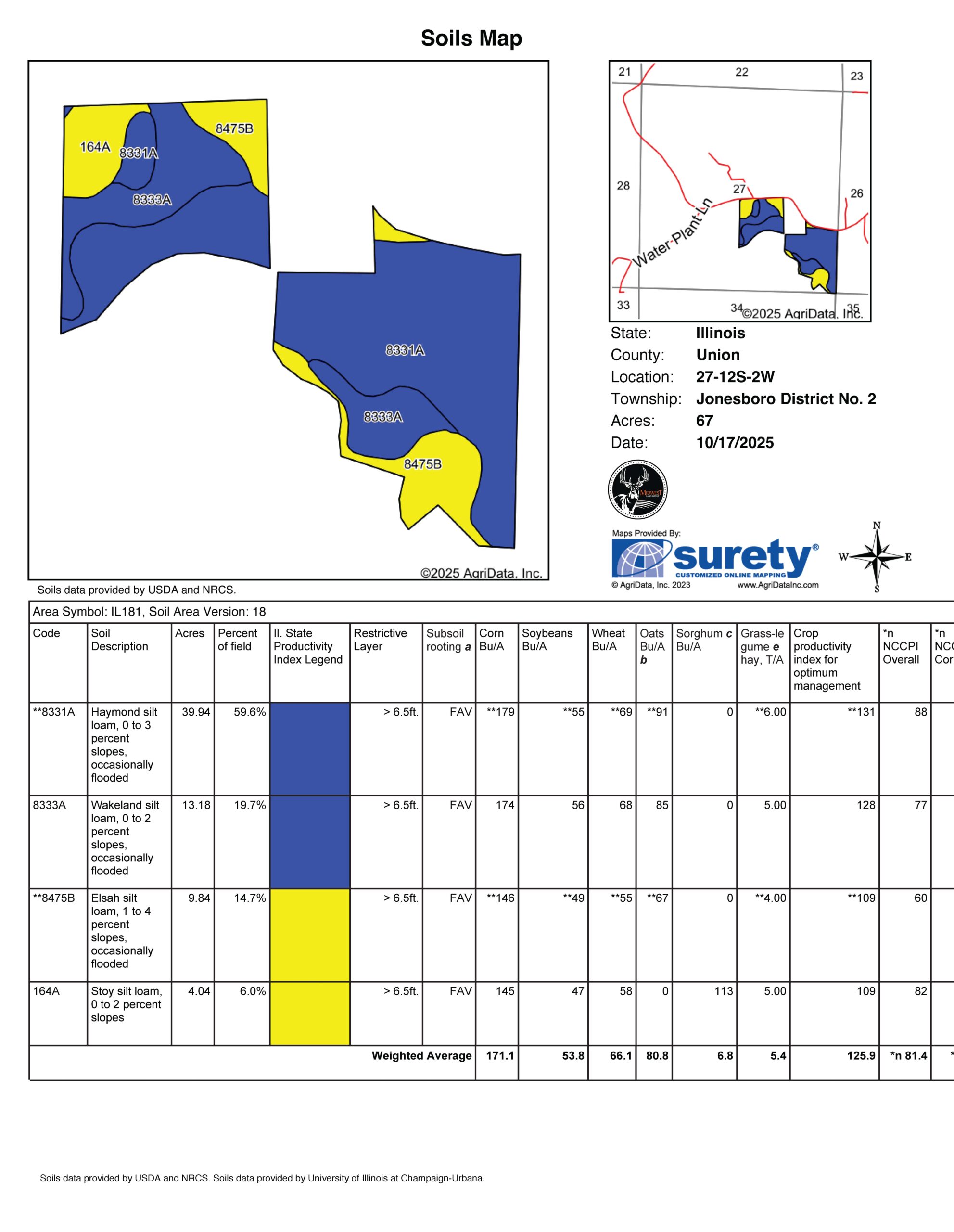Located just 3 miles west of Jonesboro, Illinois, and off of Berryville Road, this 67 +/- total acre Union County farm has high-yielding productivity on a mostly tillable tract. Soil types are haymond and wakeland silt with a crop productivity index average of 125.The property consists of one 27 +/- acre field with a rock creek flowing along the south end of the field. It is accessible from Berryville Road.