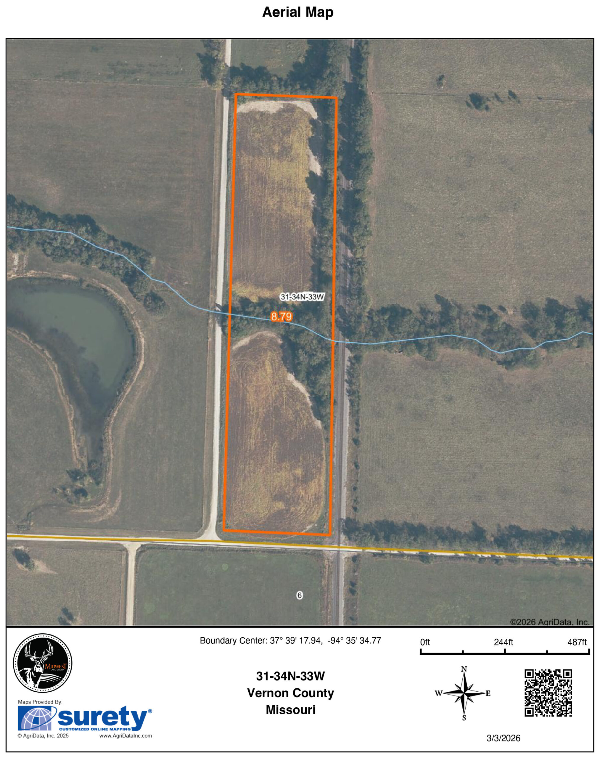 Nestled between a sprawling ranch and secluded timber sits this 9 +/-acres in southern Vernon County, Missouri. The 8 +/-acres of tillable ground is Class 3 Parson Silt Loam, which makes it ideal for row crop or hay pasture if you choose to sow it back to grass. The wet-weather creek provides the potential for a small pond to be built to water livestock or wildlife. With gravel road frontage on two sides and a paved highway just a little over a mile away, you can access the property without any issues. I personally have seen deer and turkey cross through this property on most mornings, and it could be an easy spot to set up a blind or hang a stand during hunting season. With no crops or a current lease on the property, it is ready for spring planting for added acreage to your farming operation.Property Features