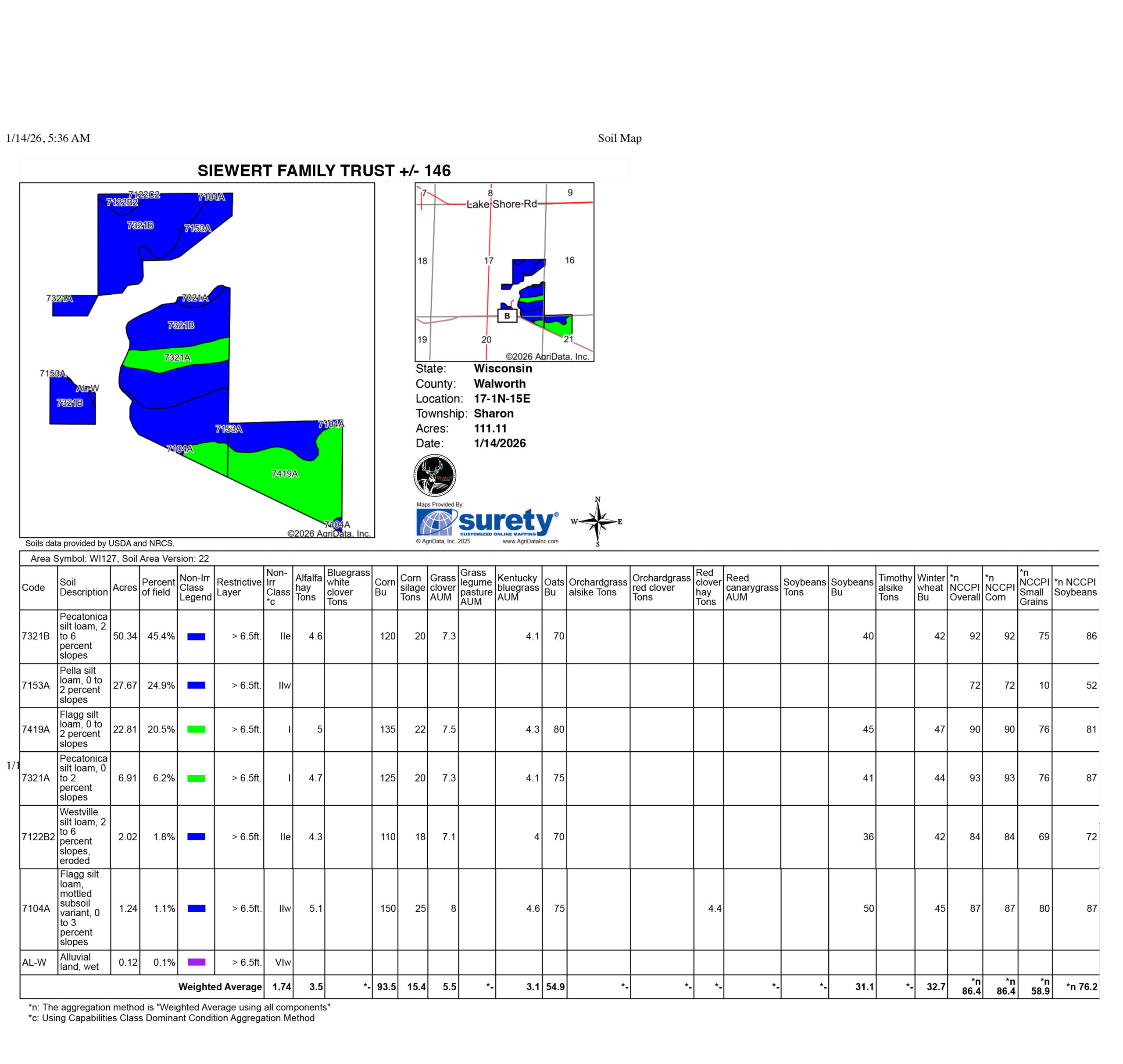 This highly productive 146 +/- acre farm is located just outside the town of Sharon in Walworth County and offers an excellent opportunity to expand or enhance an existing row-crop operation. The property features 111.11 +/- FSA acres of tillable ground with an NCPPI overall score of 86.4, reflecting strong soil productivity across the farm.