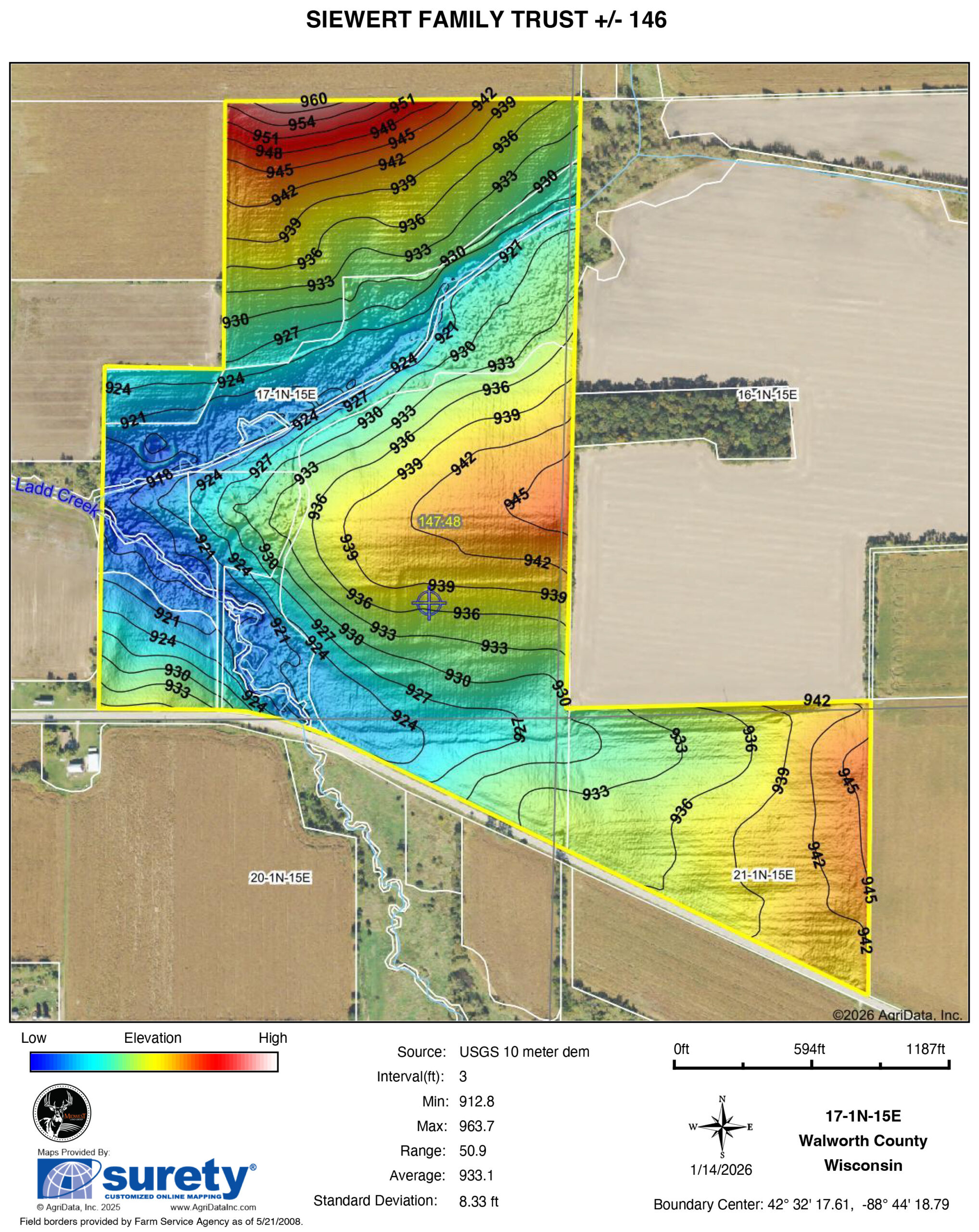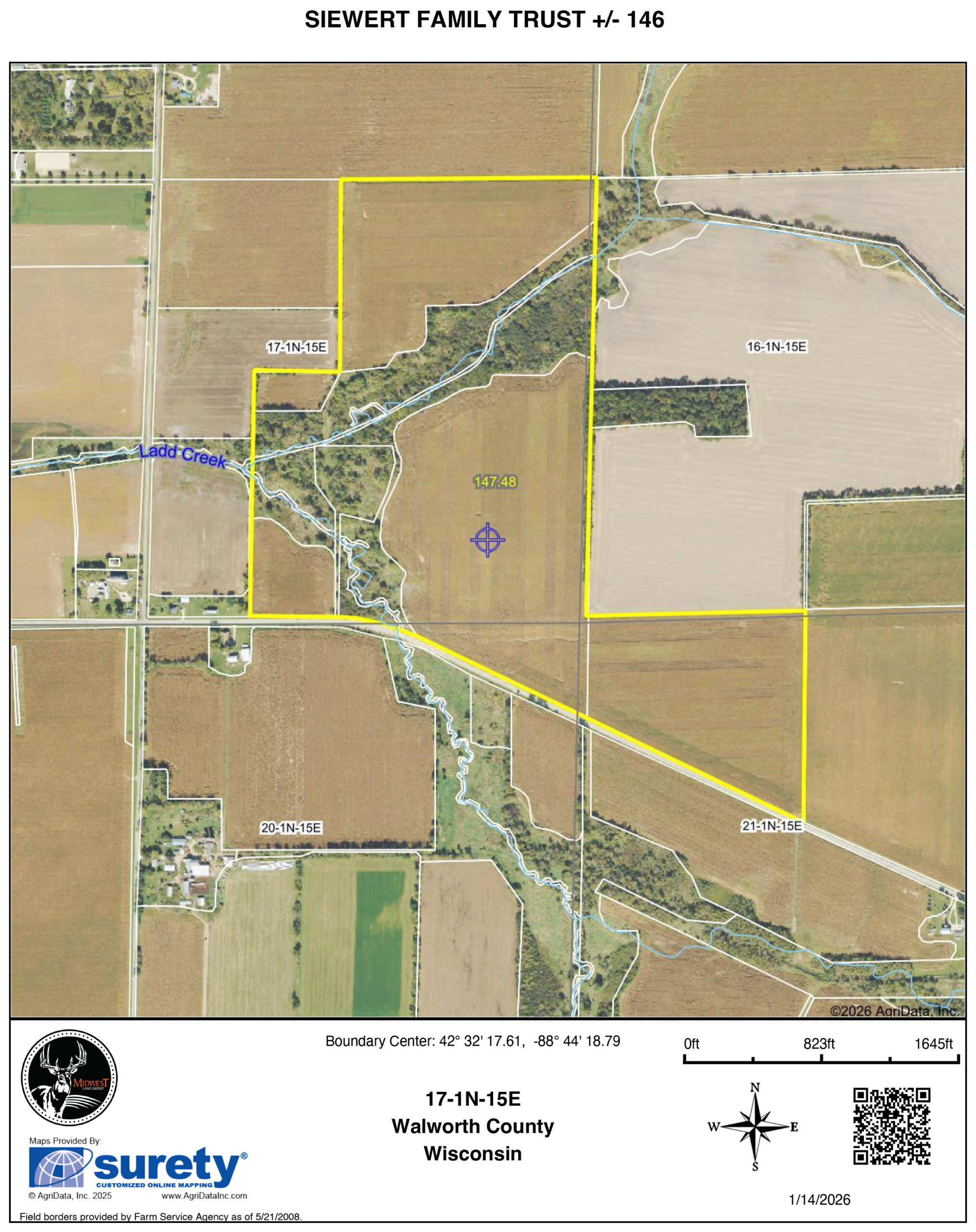 Ladd Creek winds through the property, adding recreational appeal and natural character to an already strong agricultural tract. The tillable acres are leased for the 2026 growing season, with the land available for owner operation or potential re-lease beginning in 2027. This is a rare opportunity to acquire a high-quality, well-located Walworth County farm with excellent soils, access, and long-term upside.