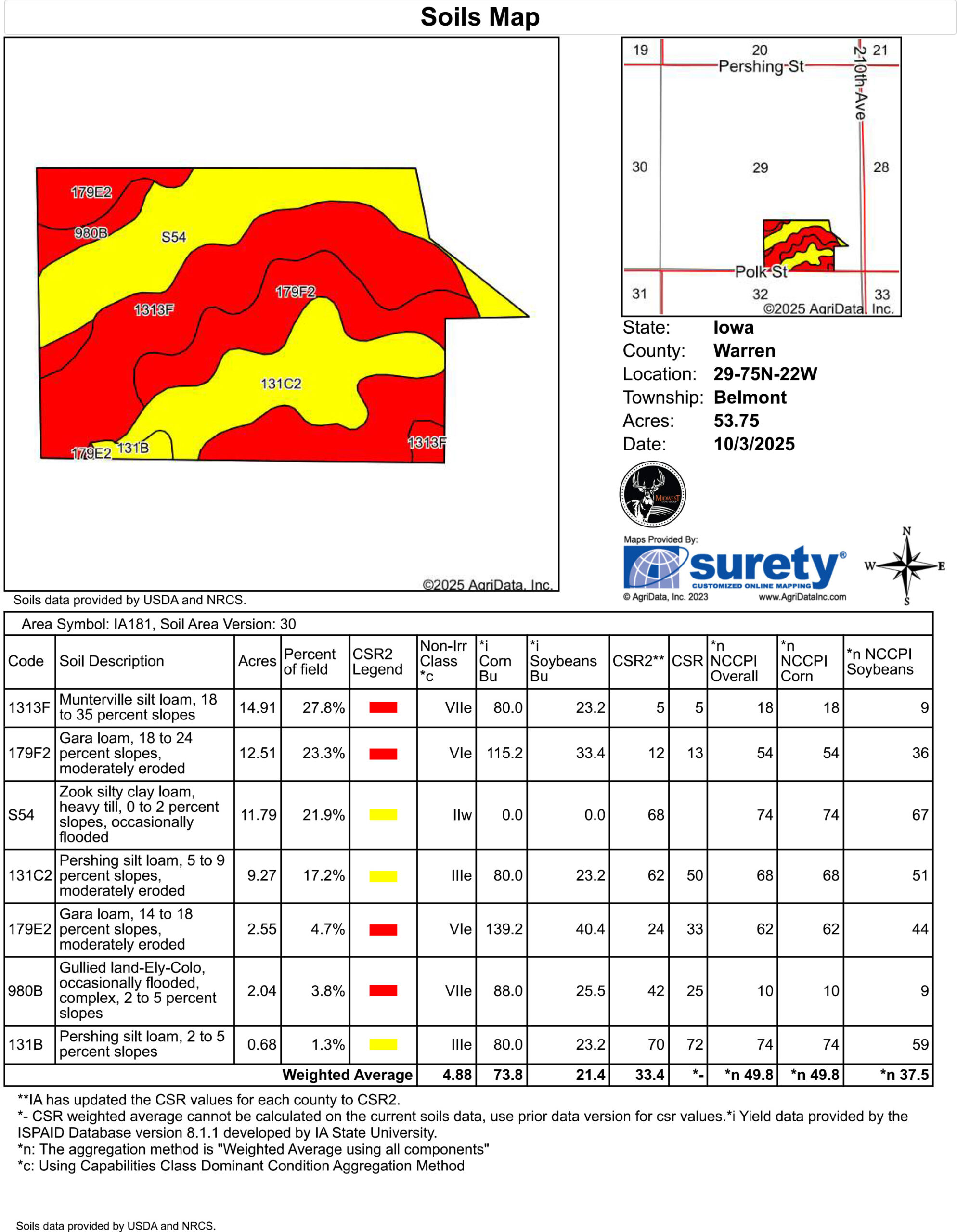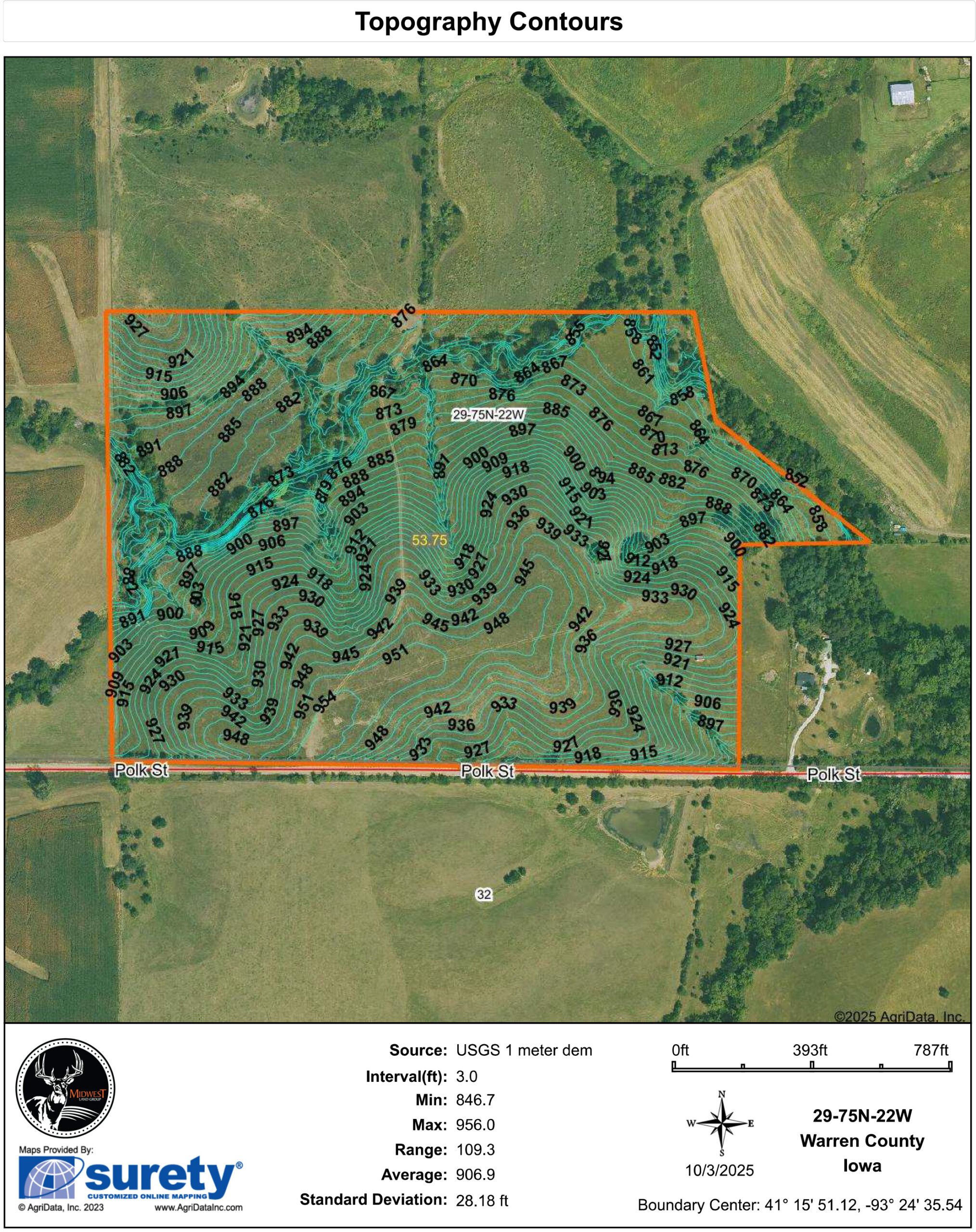 Located just 4 miles from Milo, Iowa, this 53.75 +/- acre property offers a great mix of open pasture and mature timber draws. Sitting on a hilltop, the farm provides impressive views of the Warren County countryside, especially at sunrise and sunset. A stream winds through the middle of the property, serving as a nearly year-round water source for both livestock and wildlife.The layout of the farm creates excellent recreational opportunities. Timber draws and natural travel corridors provide habitat for whitetail deer and turkeys, while the open areas offer room for multiple food plots or additional grazing ground. For buyers interested in agricultural use, the plentiful pasture makes this an ideal property for livestock or hobby farming.