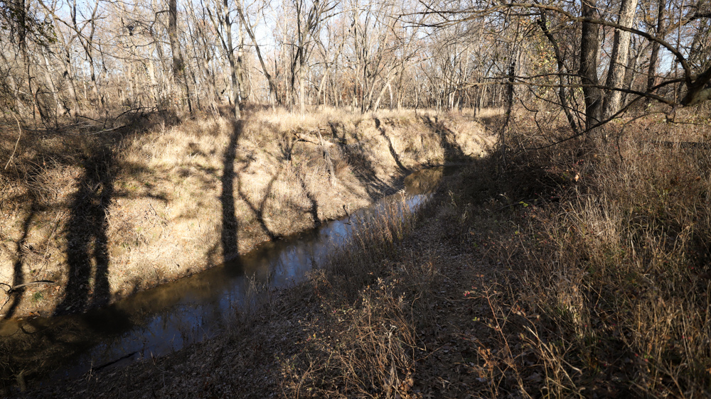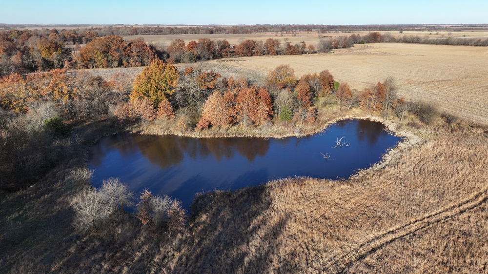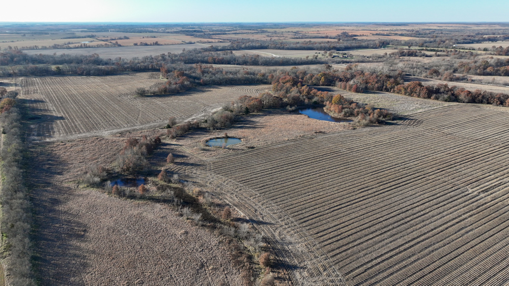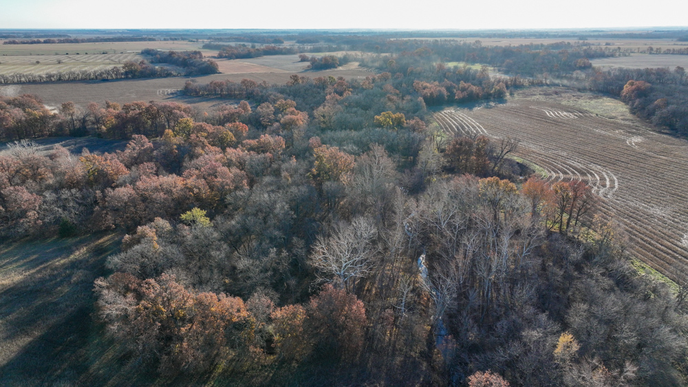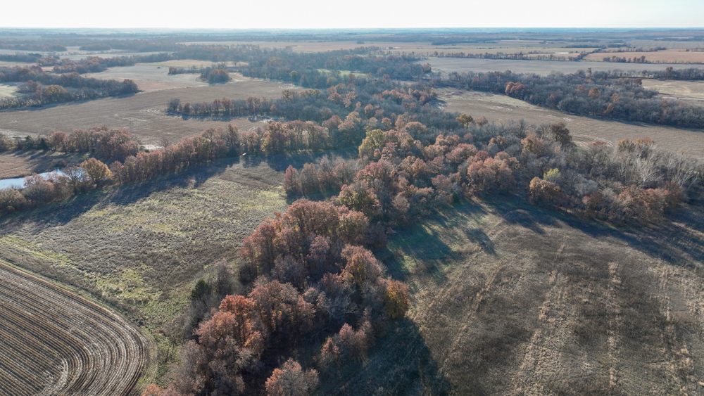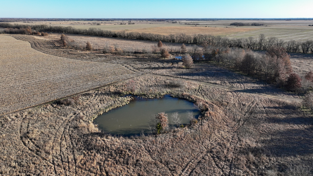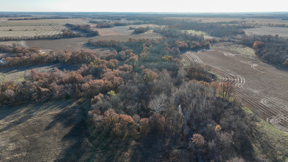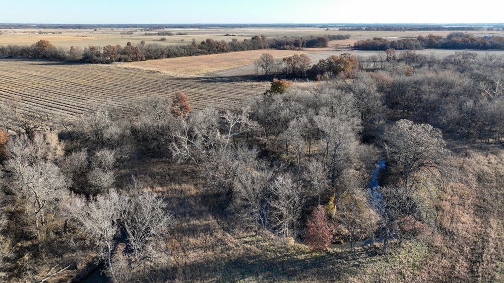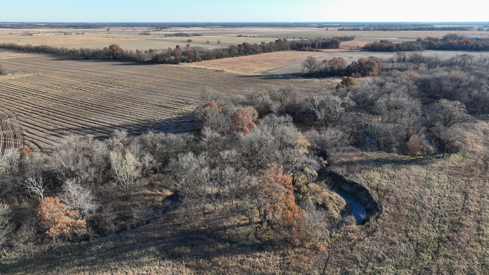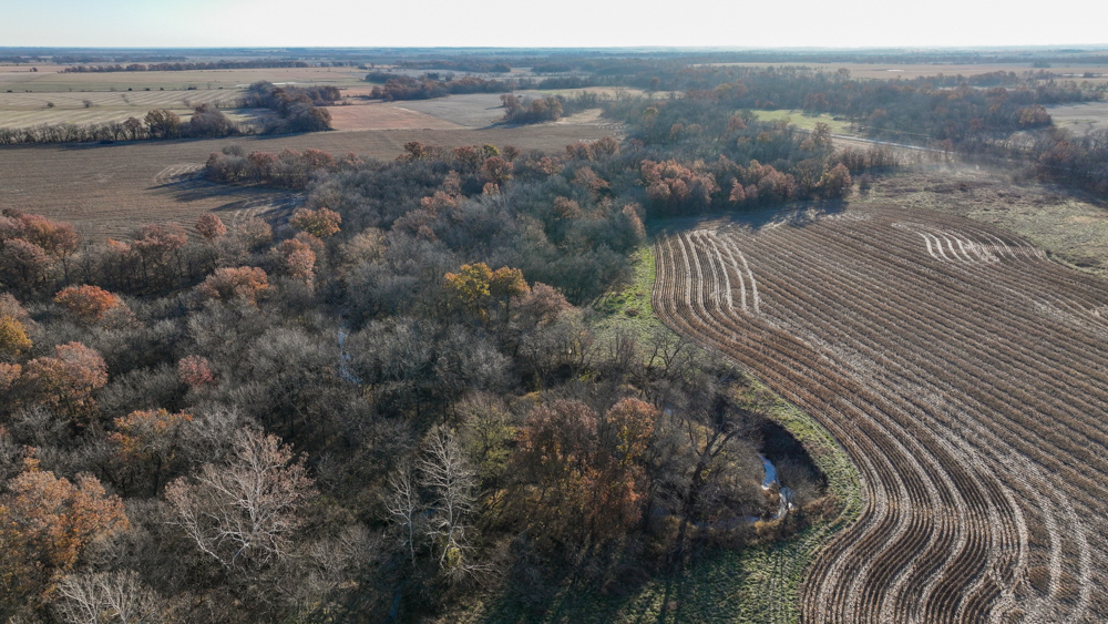 The remaining 110 +/- acres feature warm-season native grass meadows and mature hardwood timber along a live creek. The native grass is clean and includes little bluestem, big bluestem, and Indian grass. The timber primarily consists of red oak, sycamore, hedge, and eastern red cedar, offering excellent cover for wildlife. South Owl Creek winds throughout the property, supplying year-round water and serving as a natural travel corridor, while multiple ponds and seasonal creeks provide additional water sources.