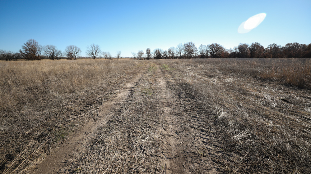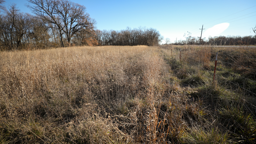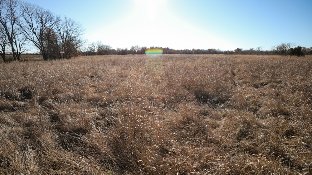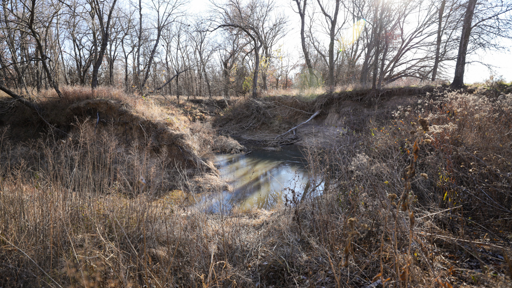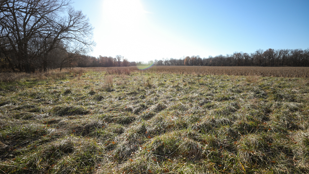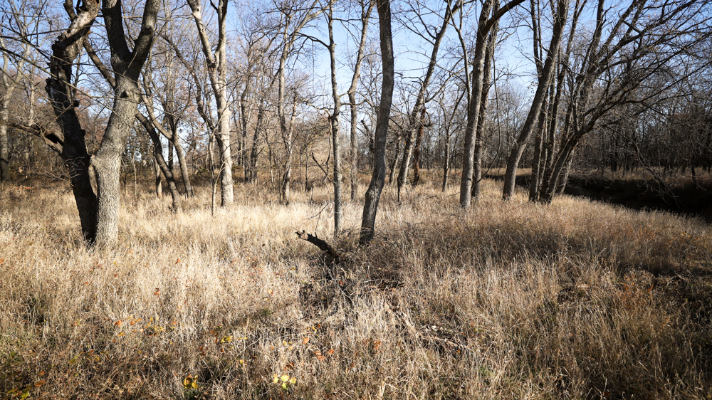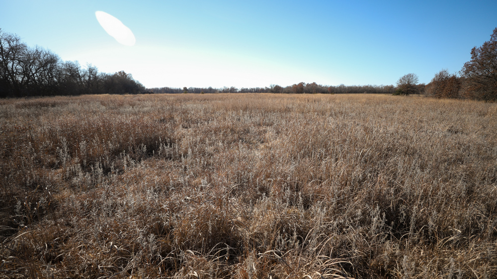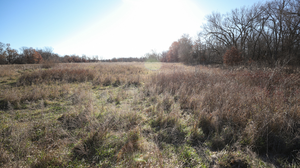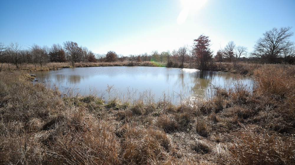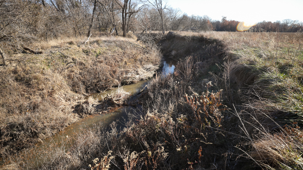 The remaining 110 +/- acres feature warm-season native grass meadows and mature hardwood timber along a live creek. The native grass is clean and includes little bluestem, big bluestem, and Indian grass. The timber primarily consists of red oak, sycamore, hedge, and eastern red cedar, offering excellent cover for wildlife. South Owl Creek winds throughout the property, supplying year-round water and serving as a natural travel corridor, while multiple ponds and seasonal creeks provide additional water sources.