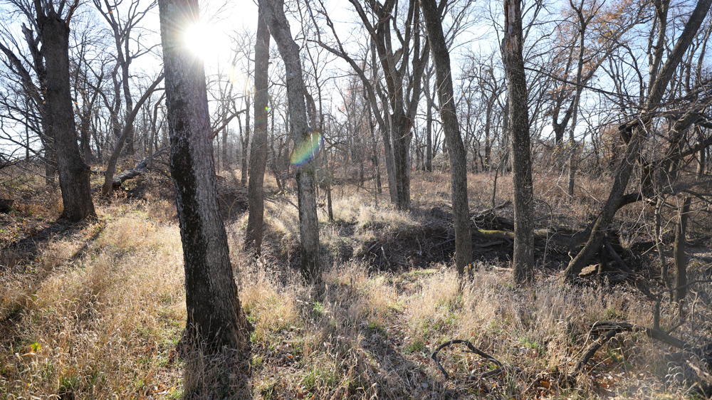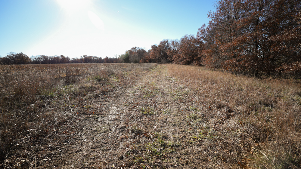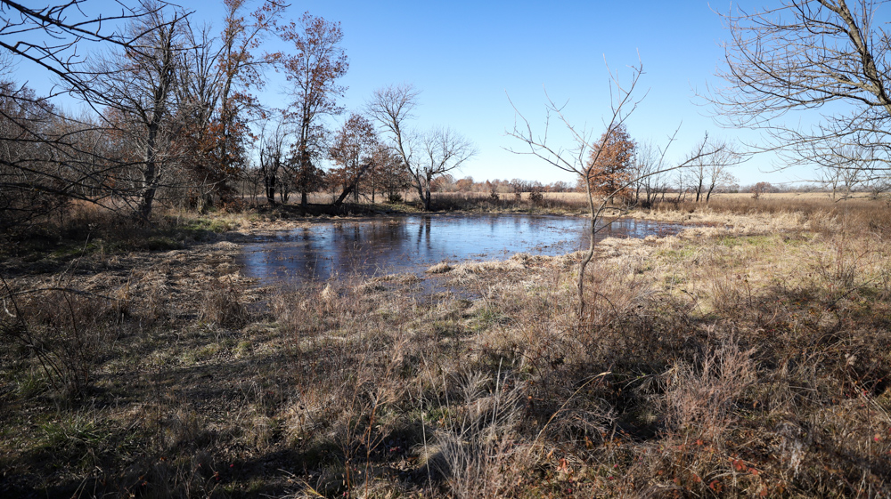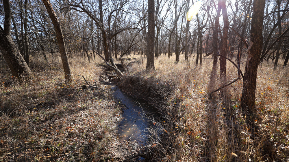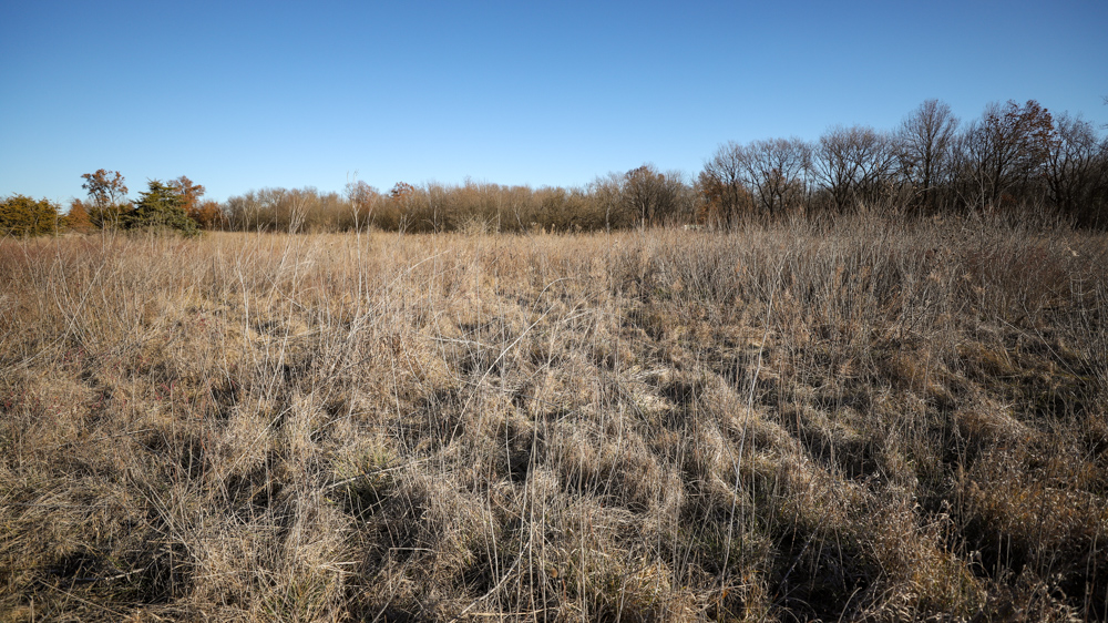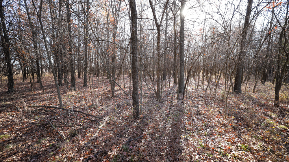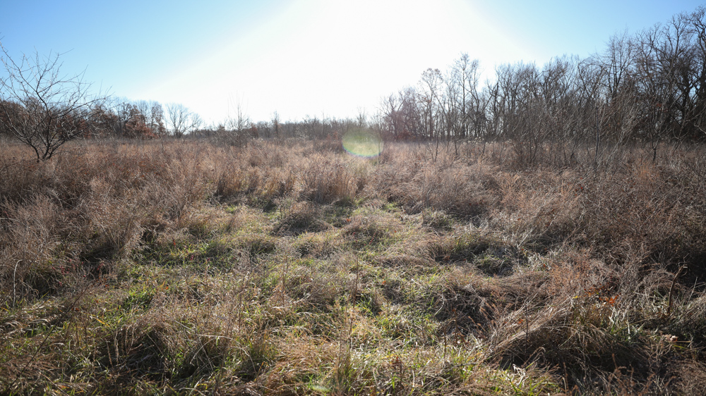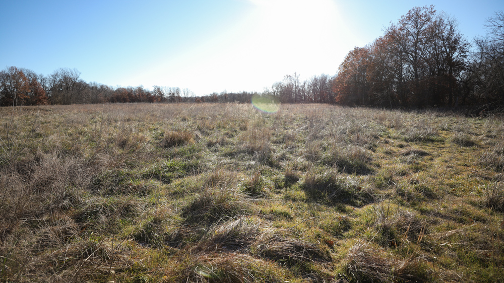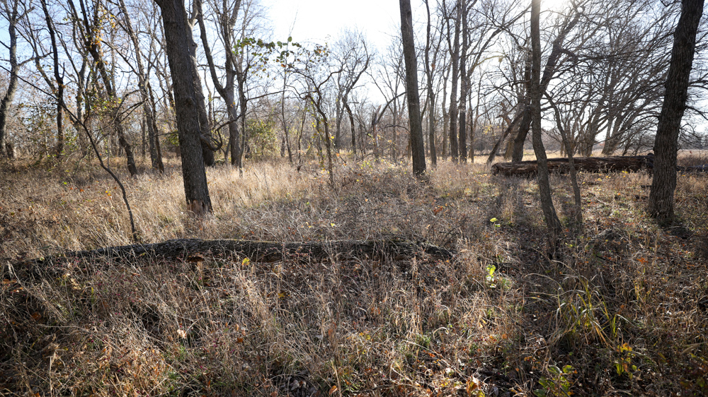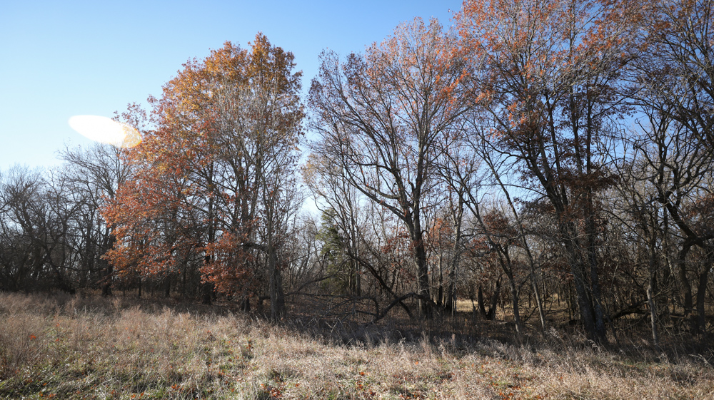 The remaining 110 +/- acres feature warm-season native grass meadows and mature hardwood timber along a live creek. The native grass is clean and includes little bluestem, big bluestem, and Indian grass. The timber primarily consists of red oak, sycamore, hedge, and eastern red cedar, offering excellent cover for wildlife. South Owl Creek winds throughout the property, supplying year-round water and serving as a natural travel corridor, while multiple ponds and seasonal creeks provide additional water sources.