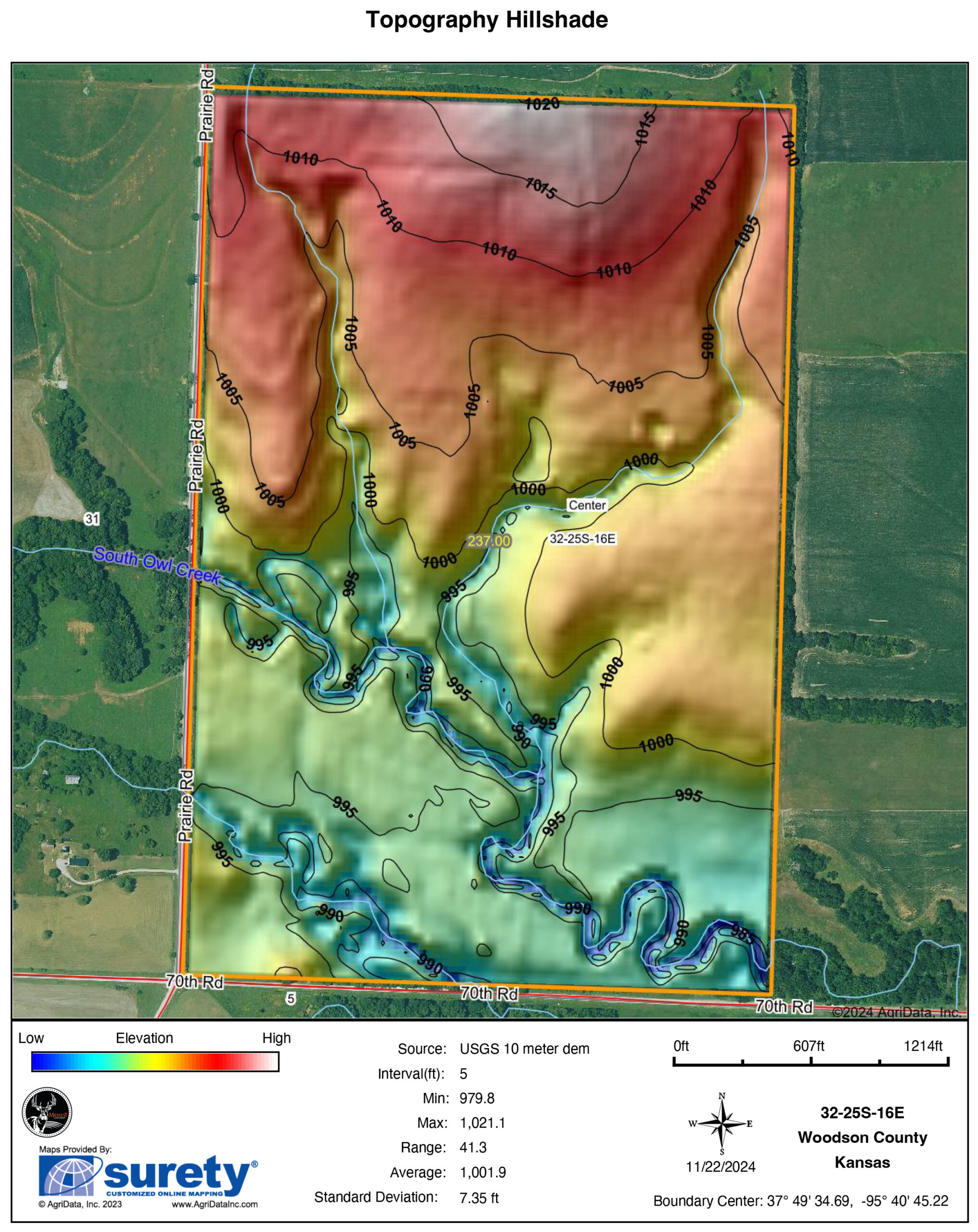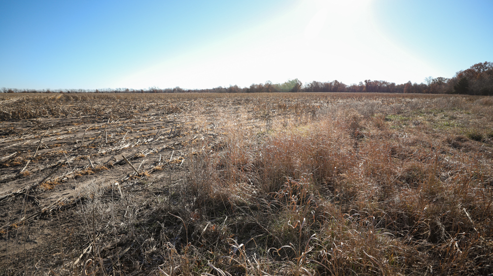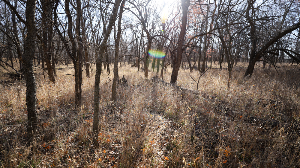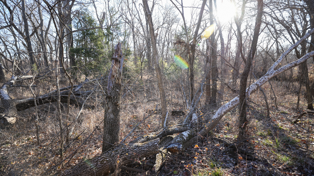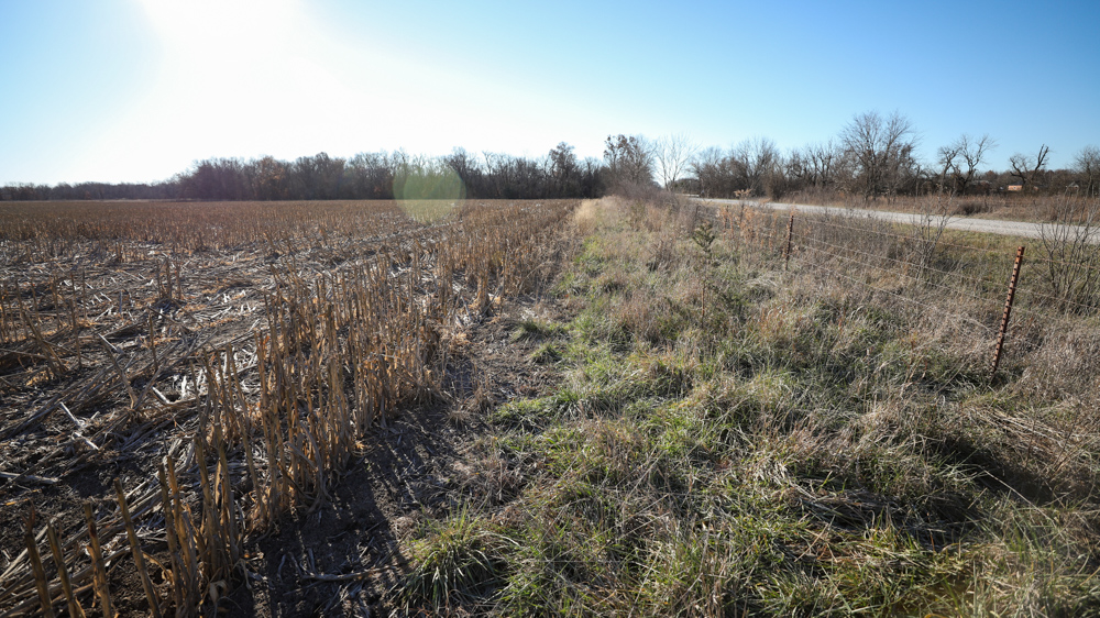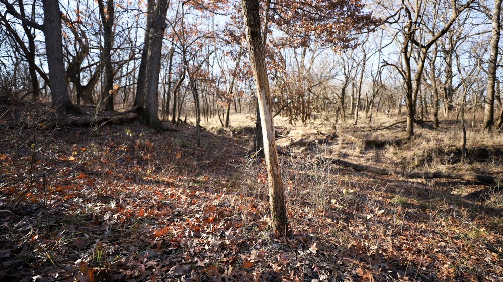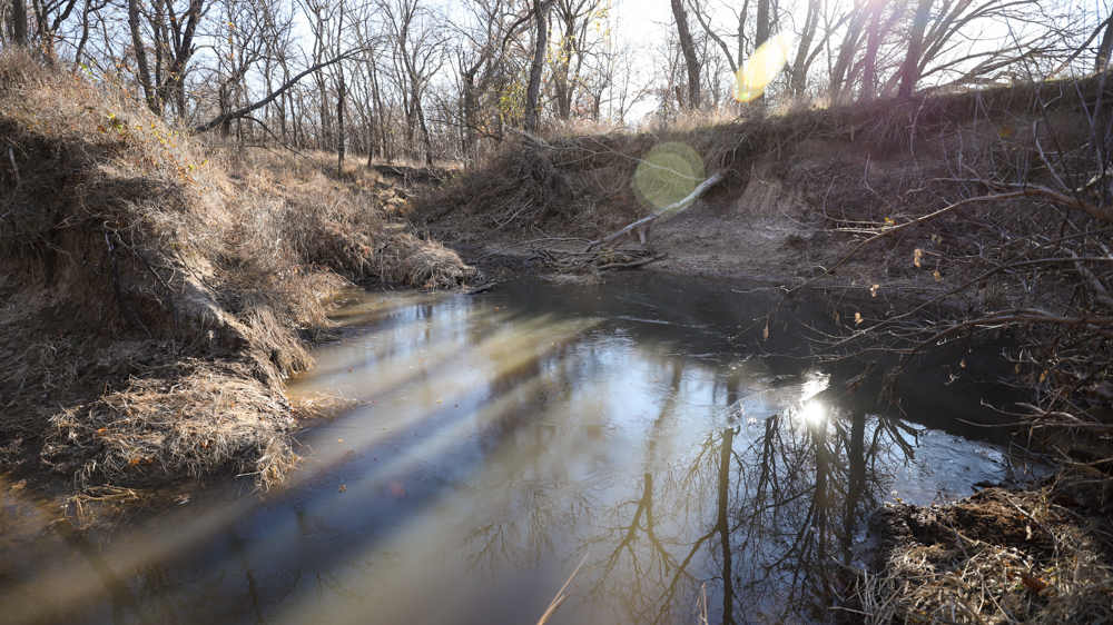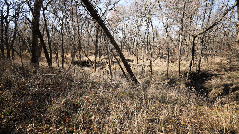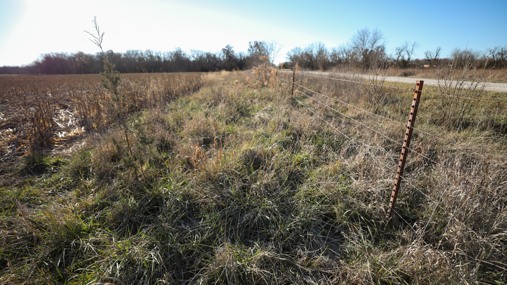 The remaining 110 +/- acres feature warm-season native grass meadows and mature hardwood timber along a live creek. The native grass is clean and includes little bluestem, big bluestem, and Indian grass. The timber primarily consists of red oak, sycamore, hedge, and eastern red cedar, offering excellent cover for wildlife. South Owl Creek winds throughout the property, supplying year-round water and serving as a natural travel corridor, while multiple ponds and seasonal creeks provide additional water sources.