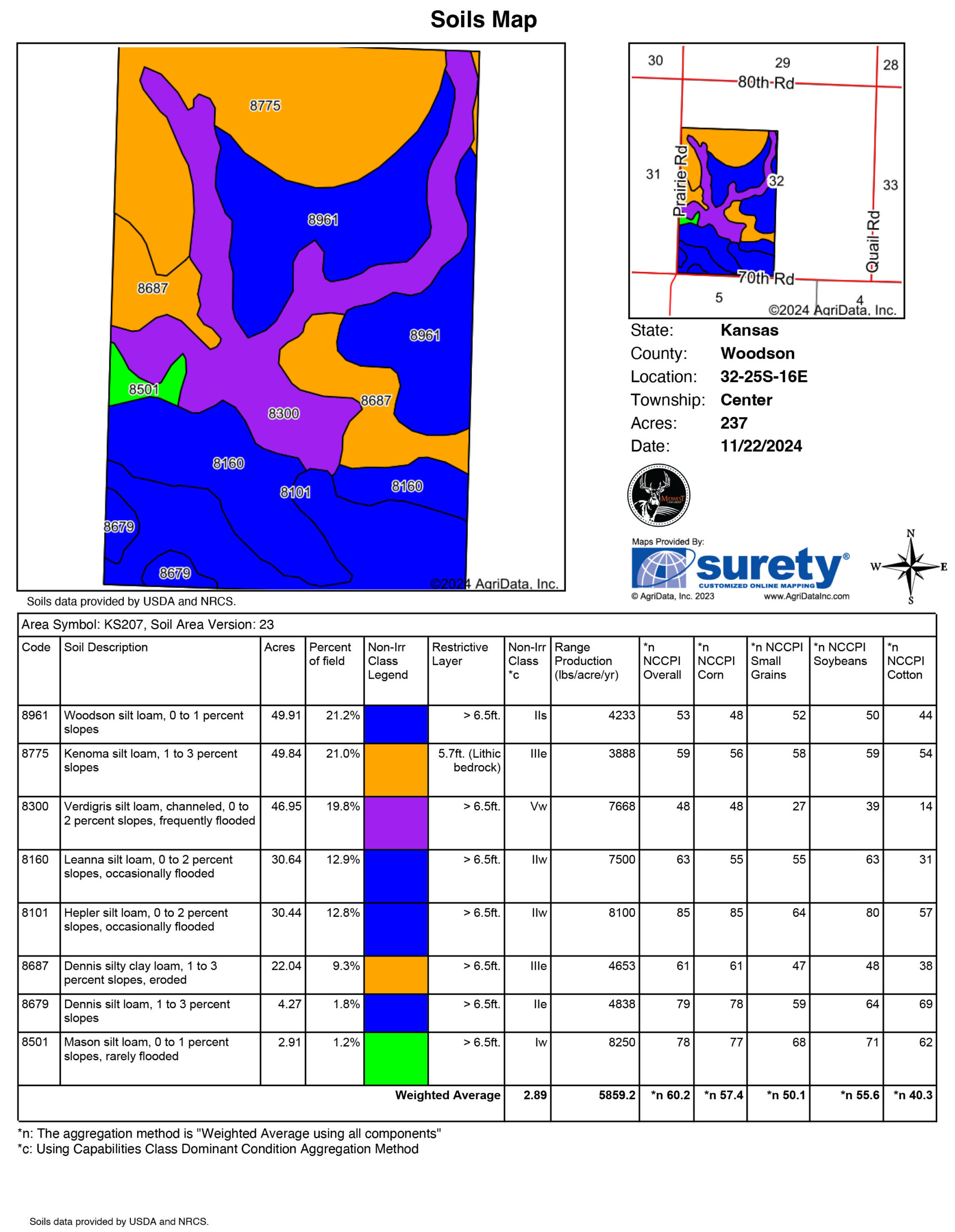 • Primarily Class II and III Woodson and Kenoma silt loam soils